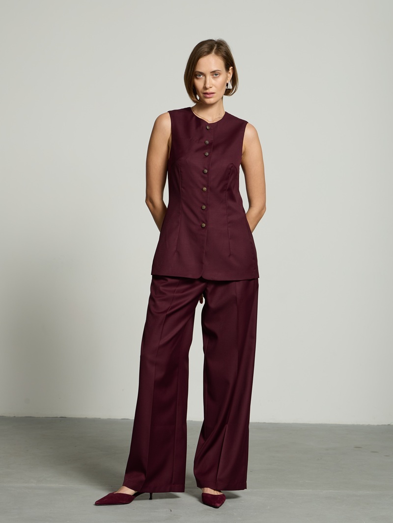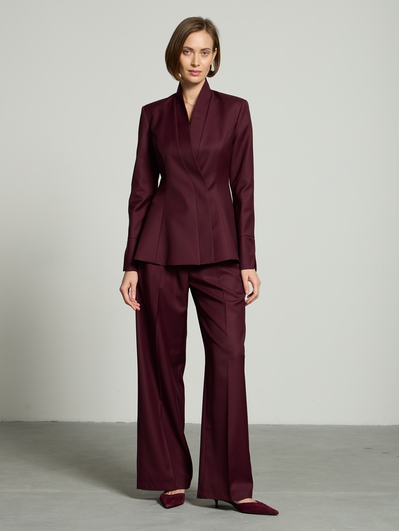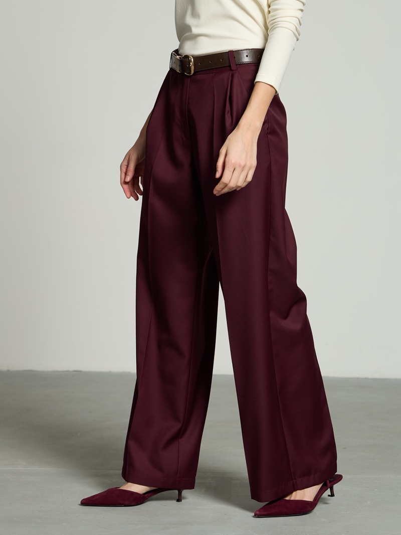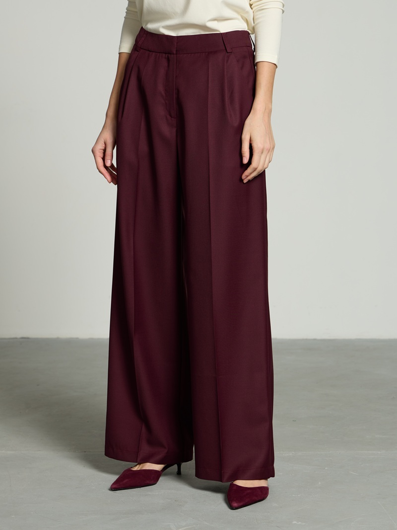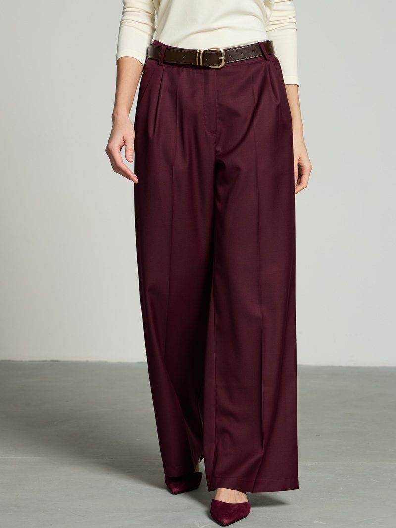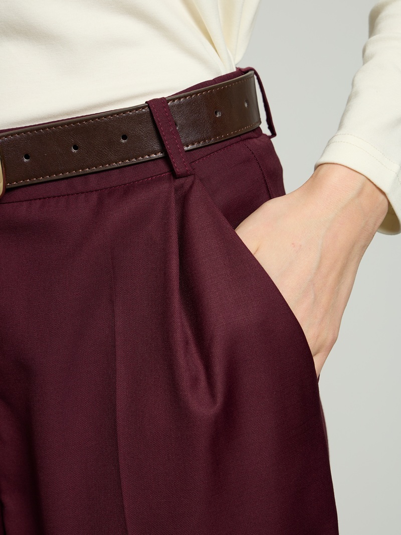 Классические брюки с глубокими защипами по талии. Застегиваются на гульфик с молнией и крючки. Смесовая шерсть приятна на ощупь и актуальна для осенне-зимнего сезона, строчки защипов визуально вытягивают силуэт, стройнят. По переду расположены карманы.