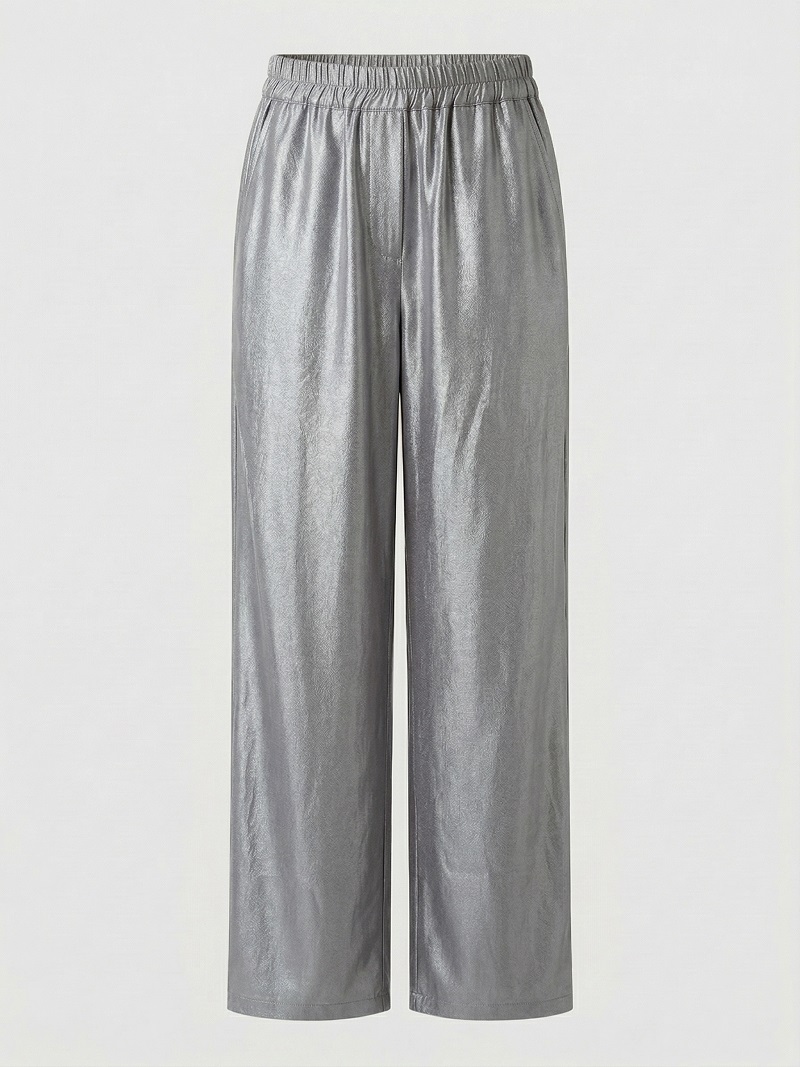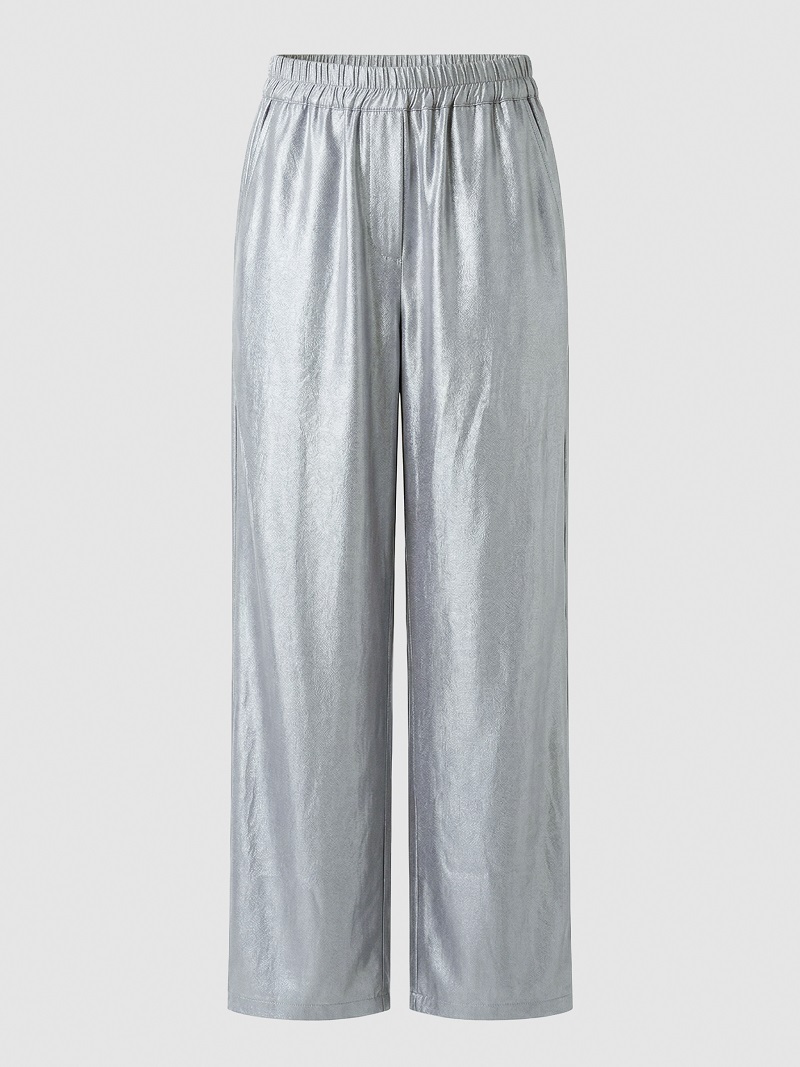 Прямые широкие брюки на резинке по талии. Материал имеет деликатный блеск и слегка струится, что создает красивое движение ткани при ходьбе.  По переду брюки дополнены карманами.
