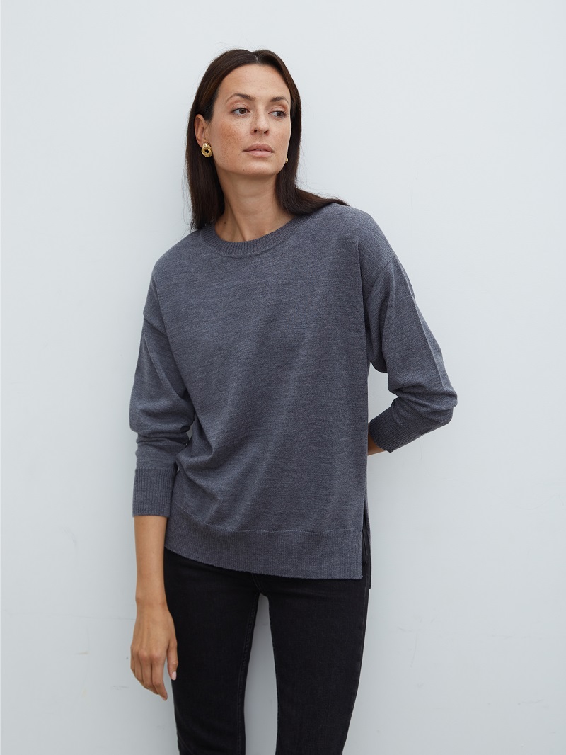 • Джемпер вязаный свободной посадки с округлой горловиной.