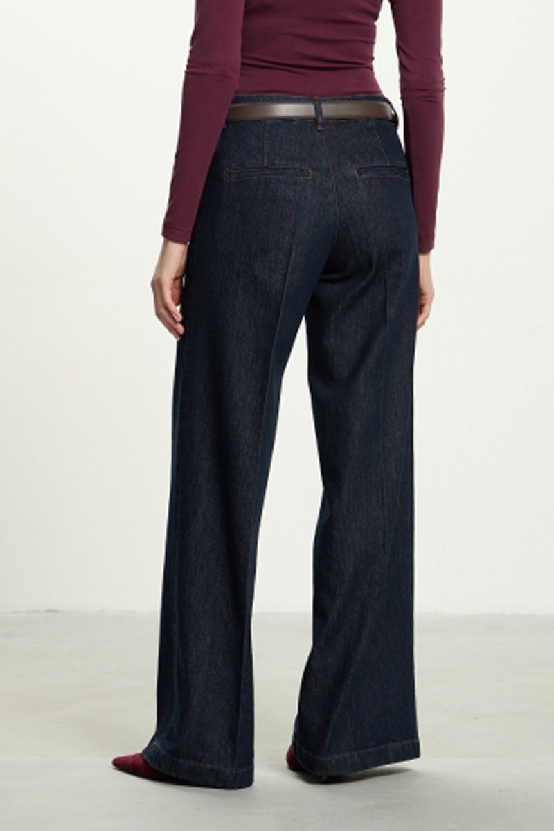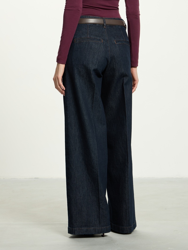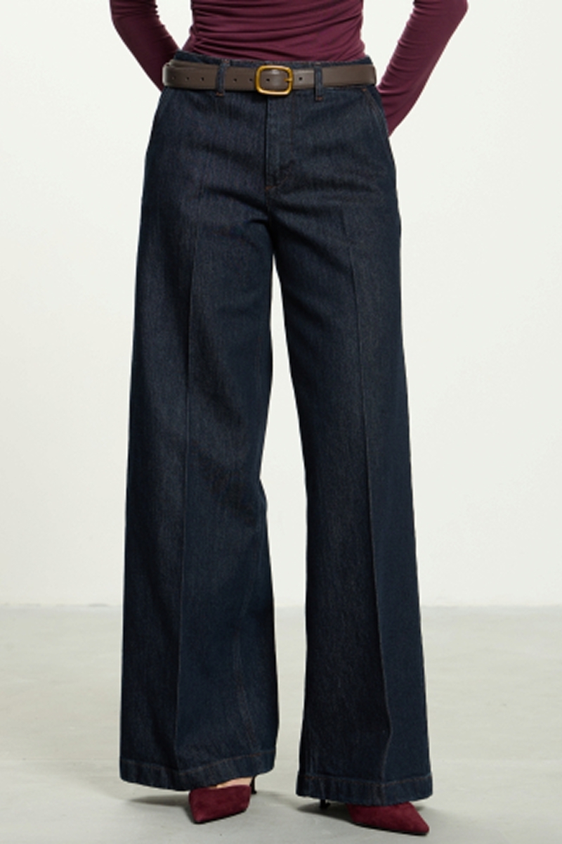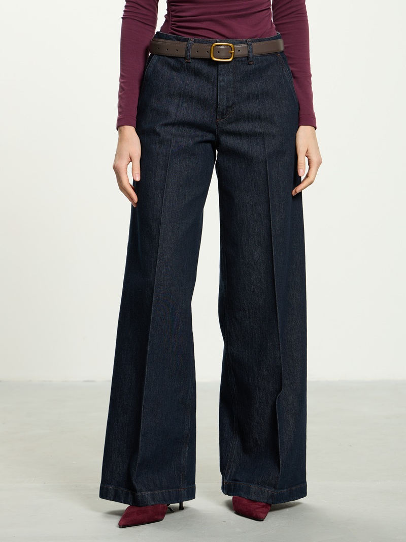 Джинсы классического синего цвета, широкие, с посадкой на талии, застегиваются на гульфик с молнией и пуговицу.