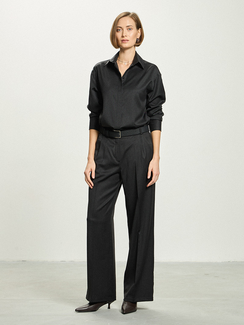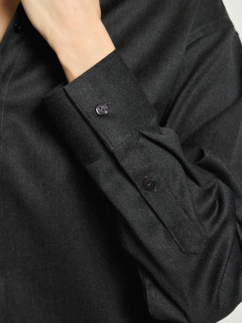 Классический рубашечный воротник хорошо держит форму, супатная застежка (пуговиц не видно, они закрыты планкой) обеспечивает лаконичность формы.