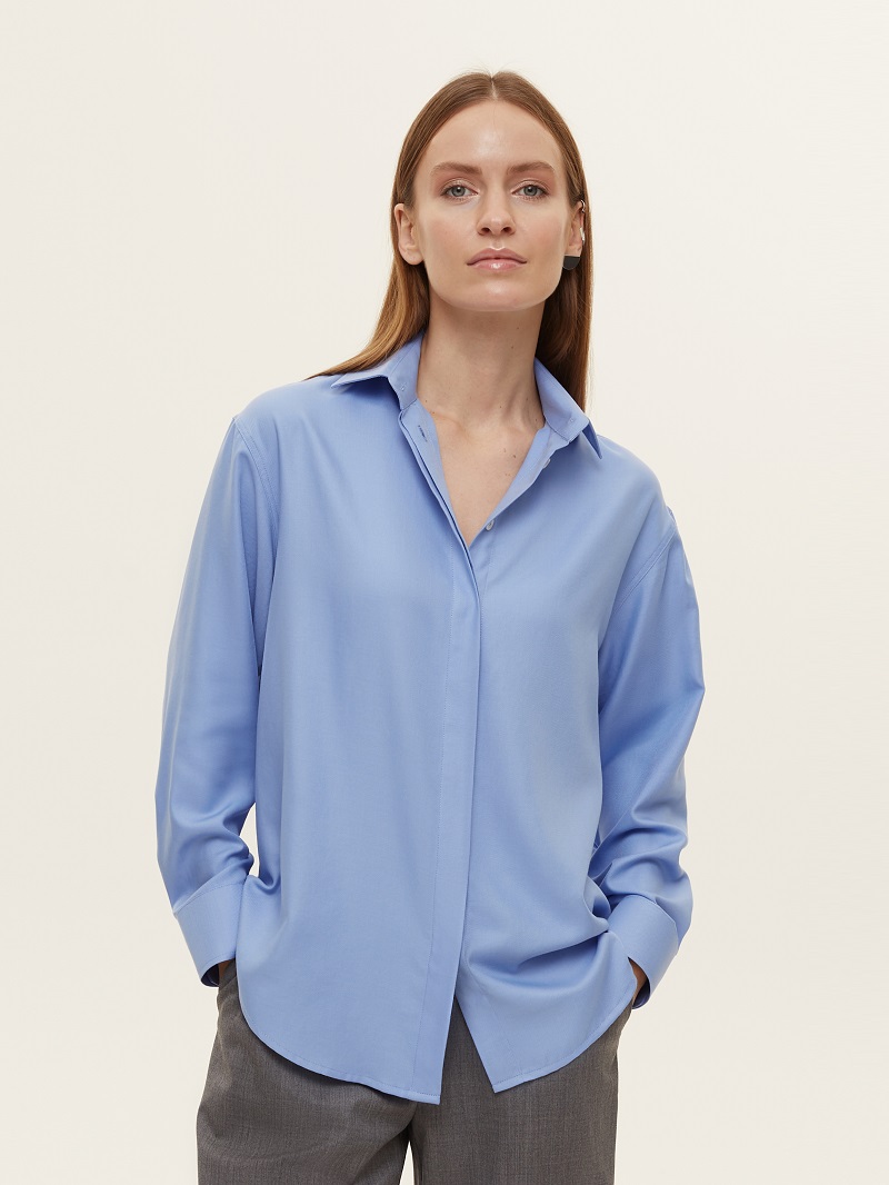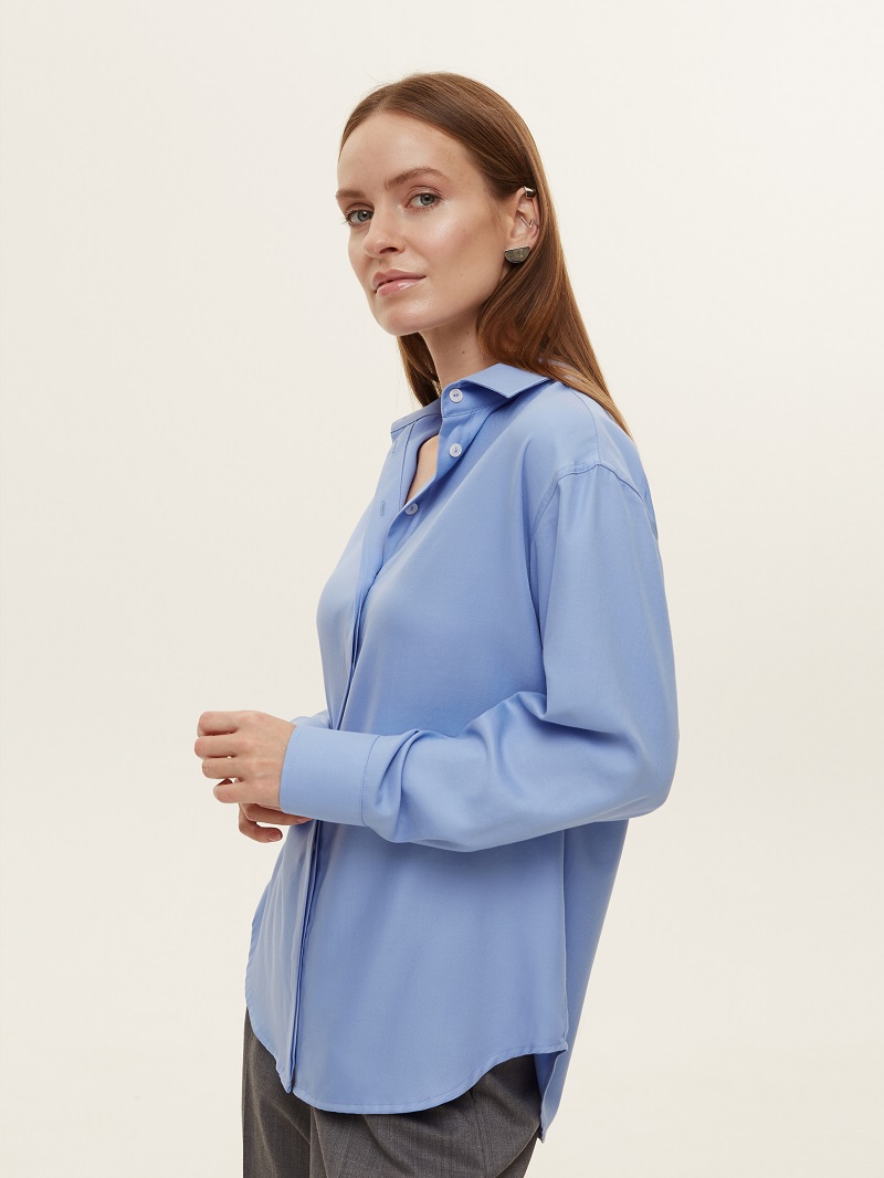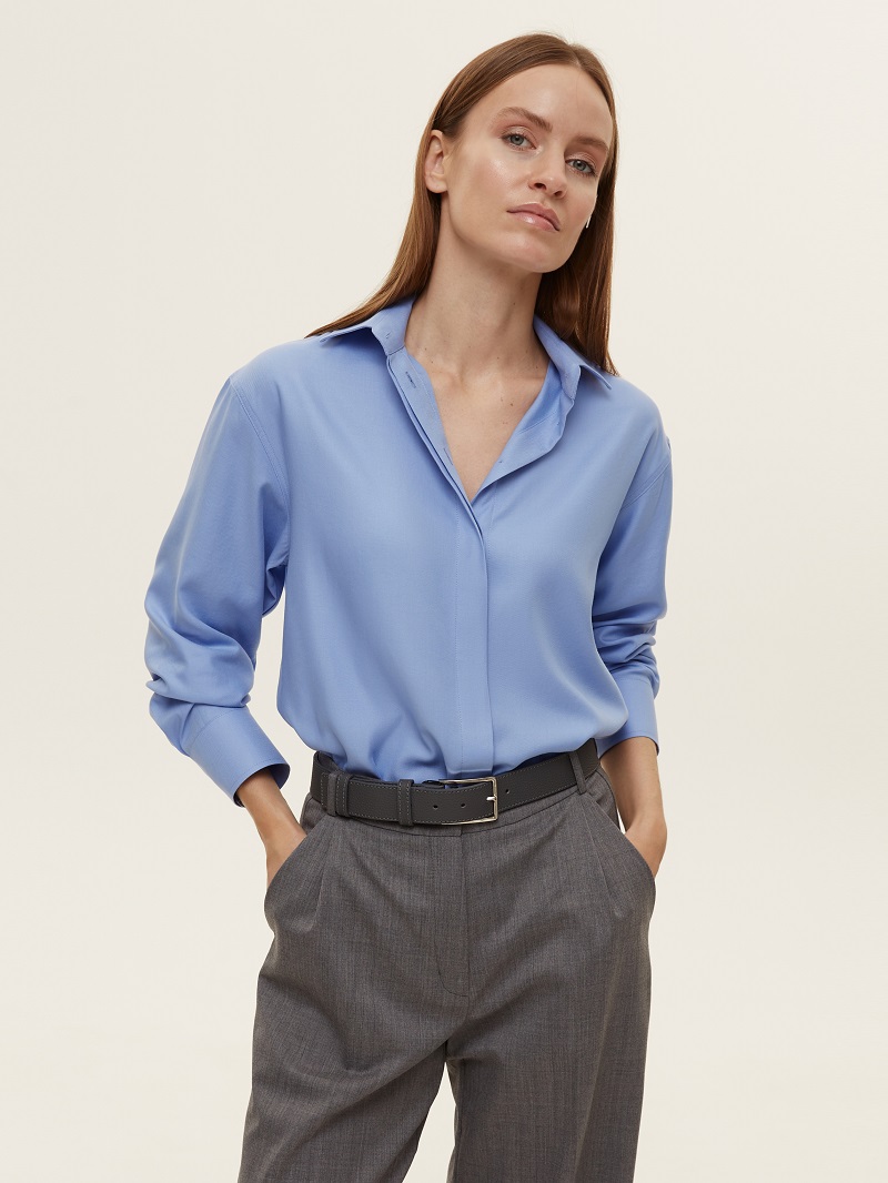 Классический рубашечный воротник хорошо держит форму, супатная застежка (пуговиц не видно, они закрыты планкой) обеспечивает лаконичность формы.