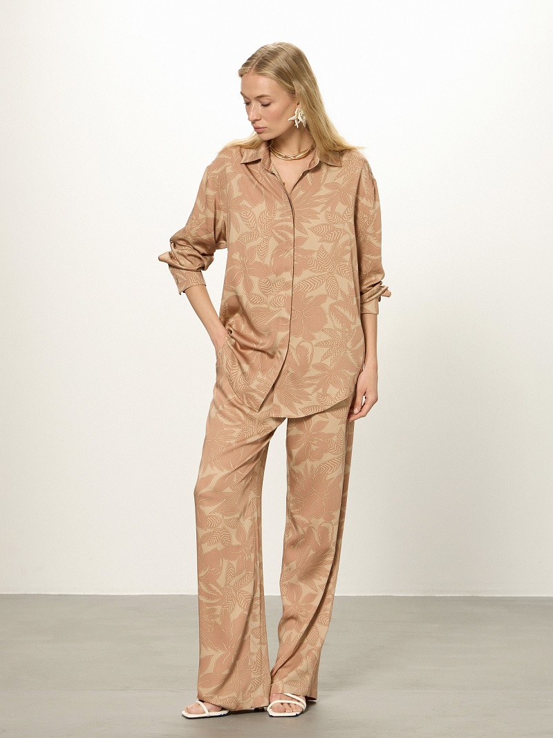 Мягкая струящаяся ткань позволит чувствовать себя комфортно в теплую погоду. Рубашка образует стильный лук вместе с брюками-палаццо из того же материала.