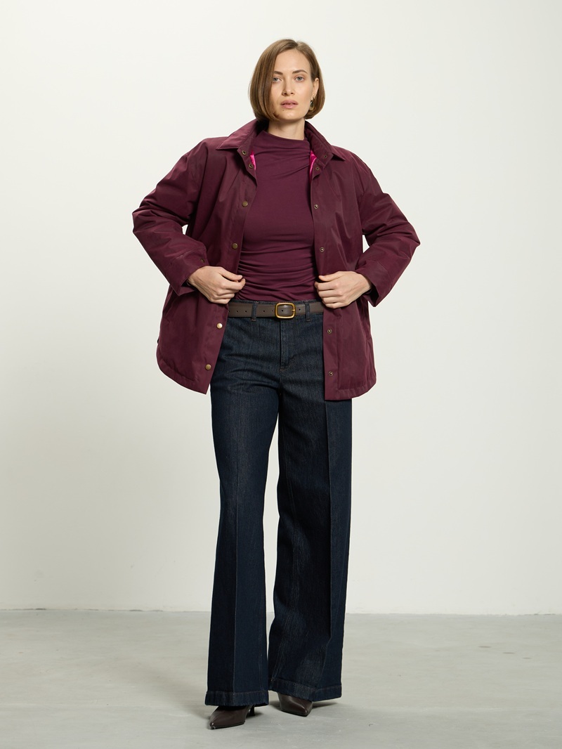 Куртка застегивается на металлические кнопки, имеет прорезные карманы с листочками, фигурную форму низа.