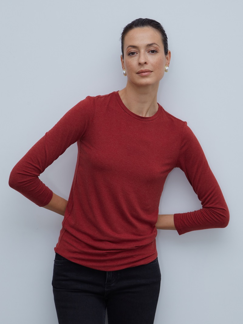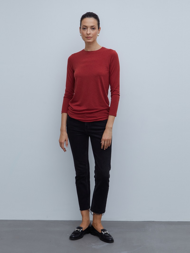 • Лонгслив прямого силуэта с длинным рукавом и округлой горловиной.