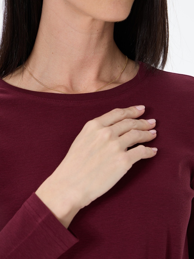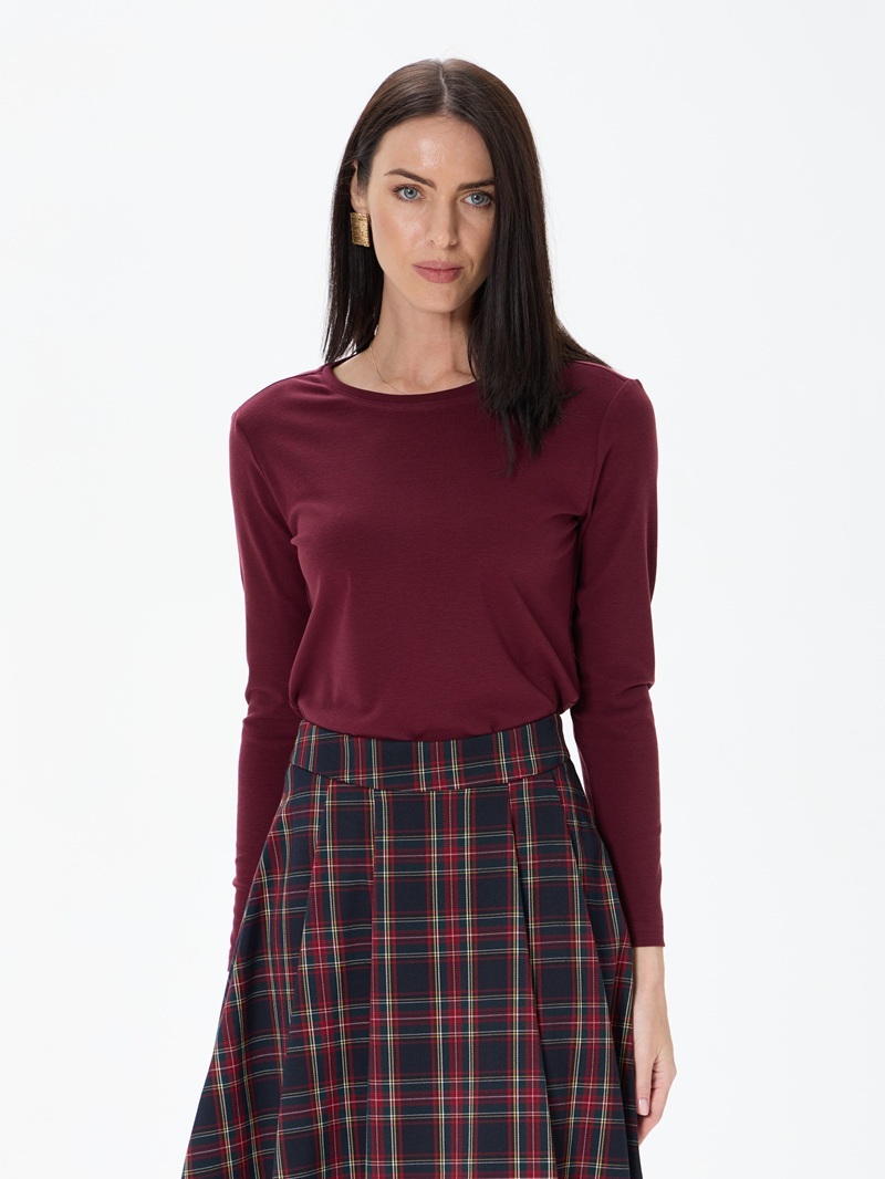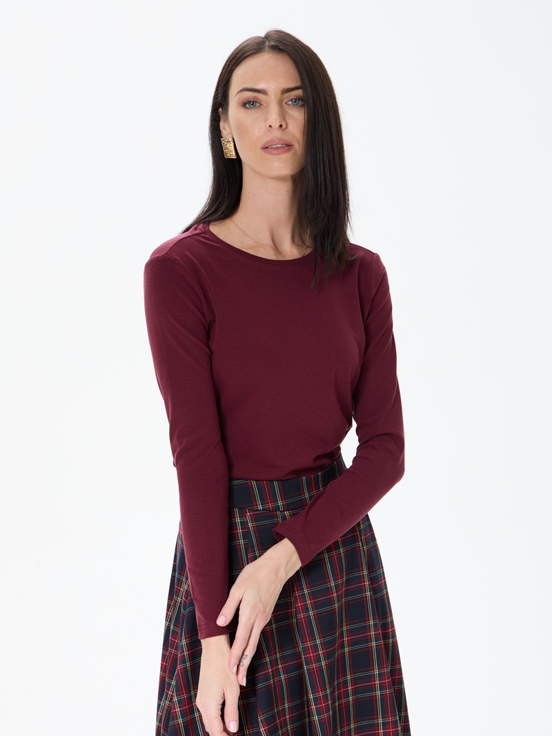 Лонгслив с круглой горловиной длинным рукавом выполнен из вискозного трикотажа с добавлением шерсти, что делает его незаменимым базовым изделием в осенне-зимнем гардеробе. Такой лонгслив хорошо будет смотреться с жакетом или жилетом в офисе, а также подойдёт для создания кэжуальных луков.