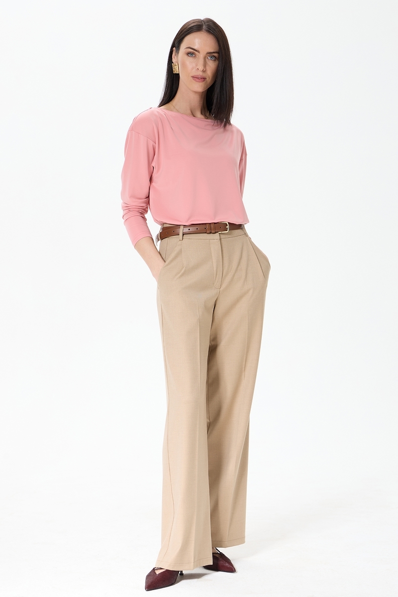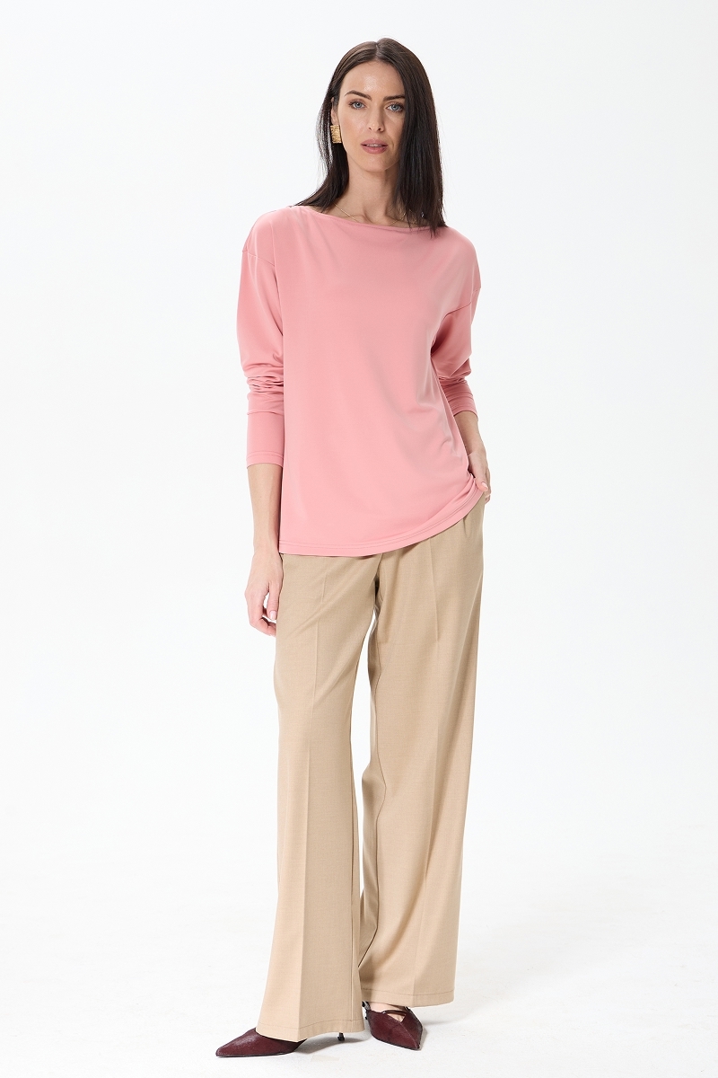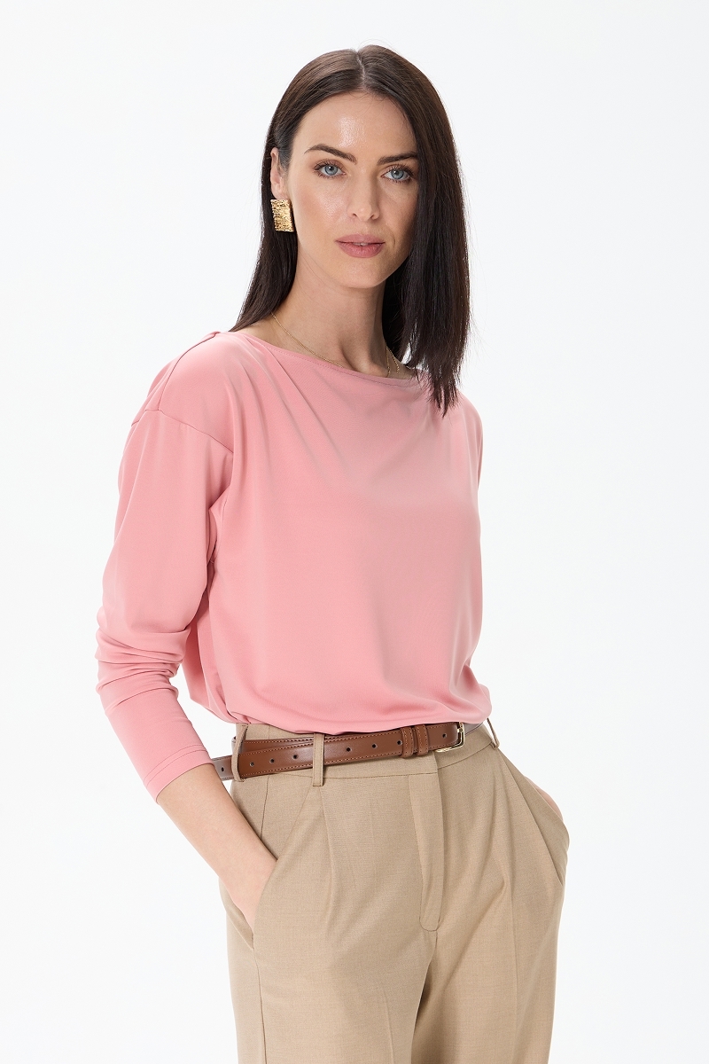 Лонгслив с горловиной "лодочка" и длинным рукавом  выполнен из мягкого и неплотного вискозного трикотажа.