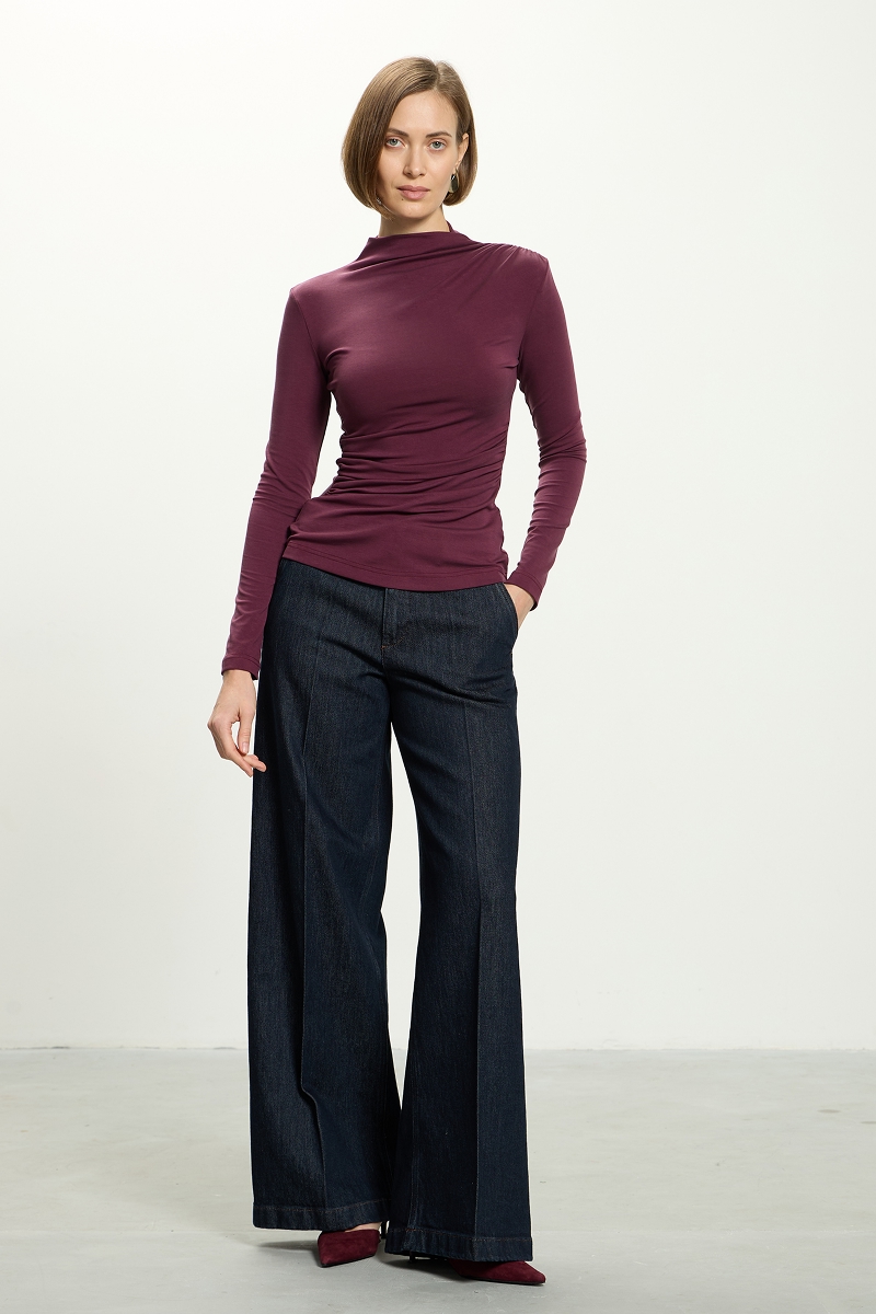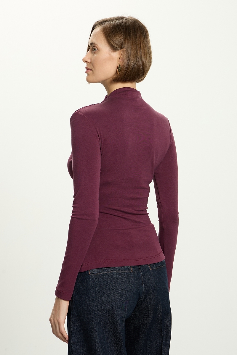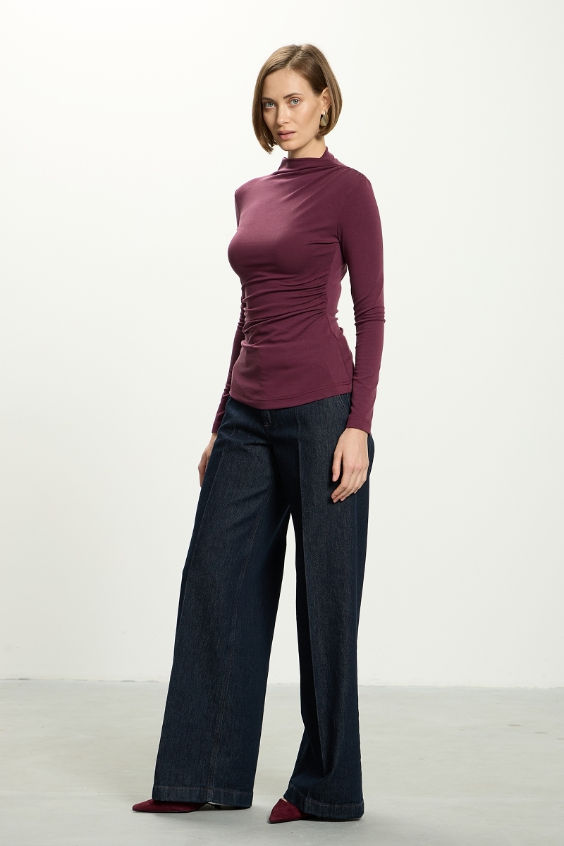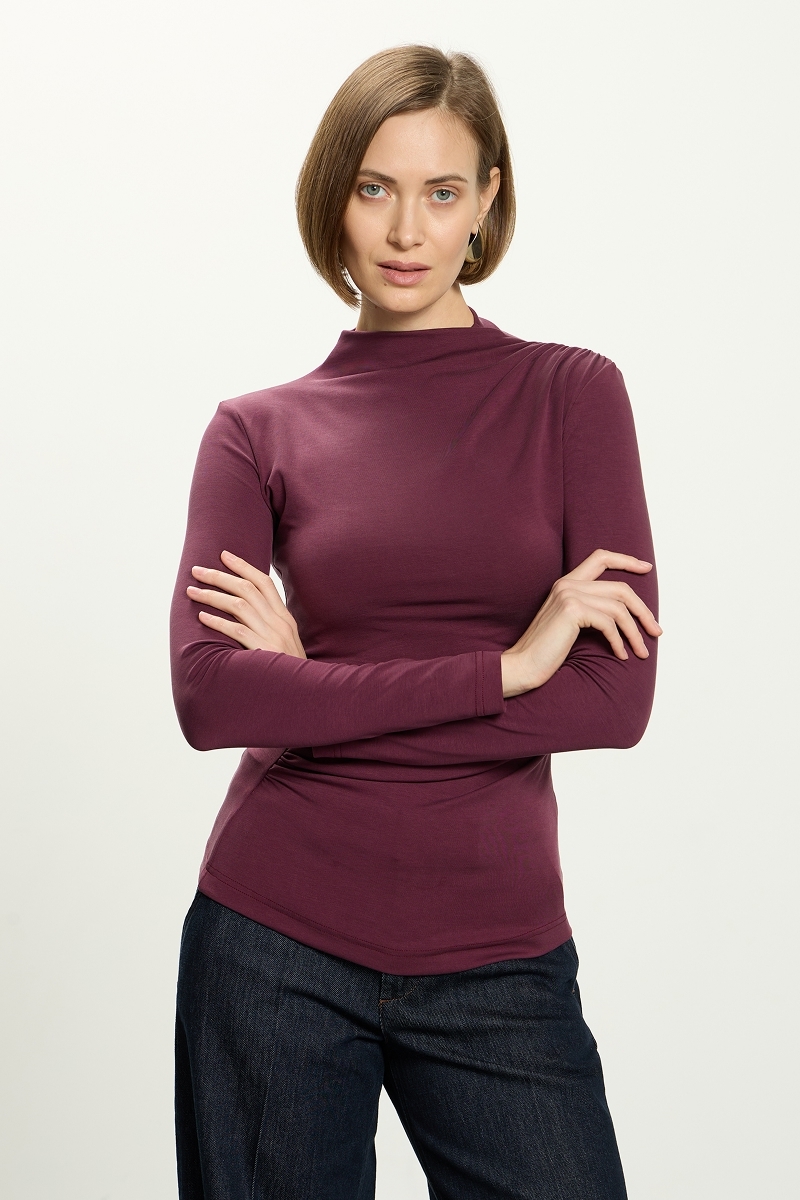 Лонгслив с воротником-стойка и элегантной драпировкой спереди, которая визуально корректирует фигуру, формирует красивый силуэт. Такой лонгслив отлично будет смотреться и самостоятельно, и как нижний слой под жакет или жилет.