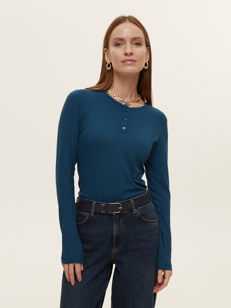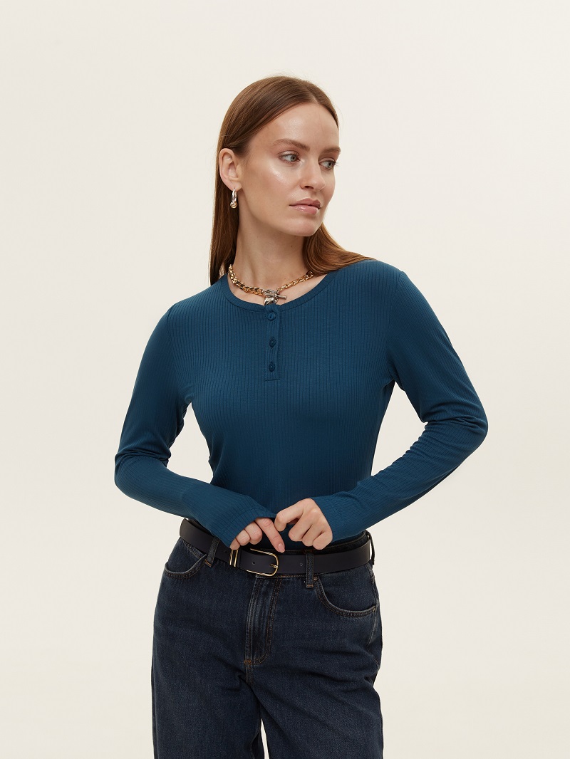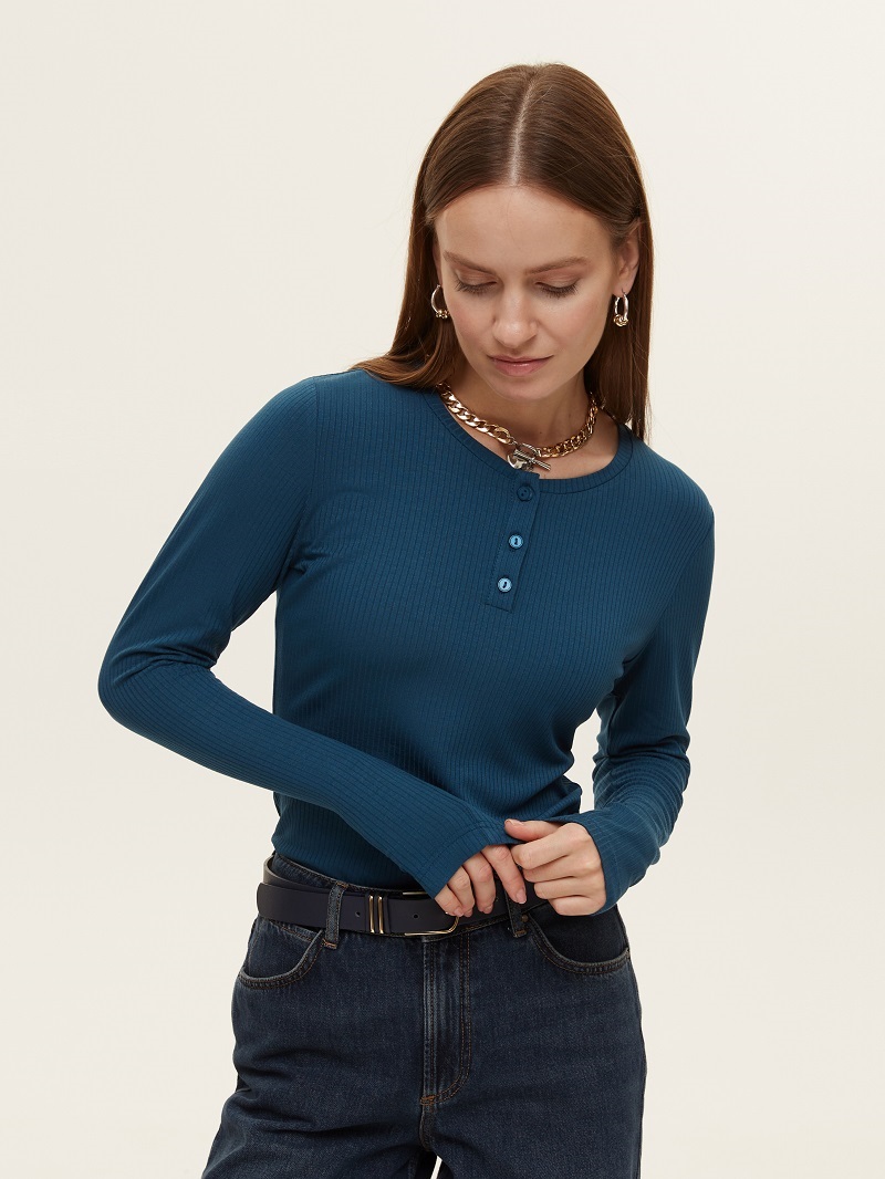 • Лонгслив приталенного силуэта с классической линией плеча и длинным рукавом.
