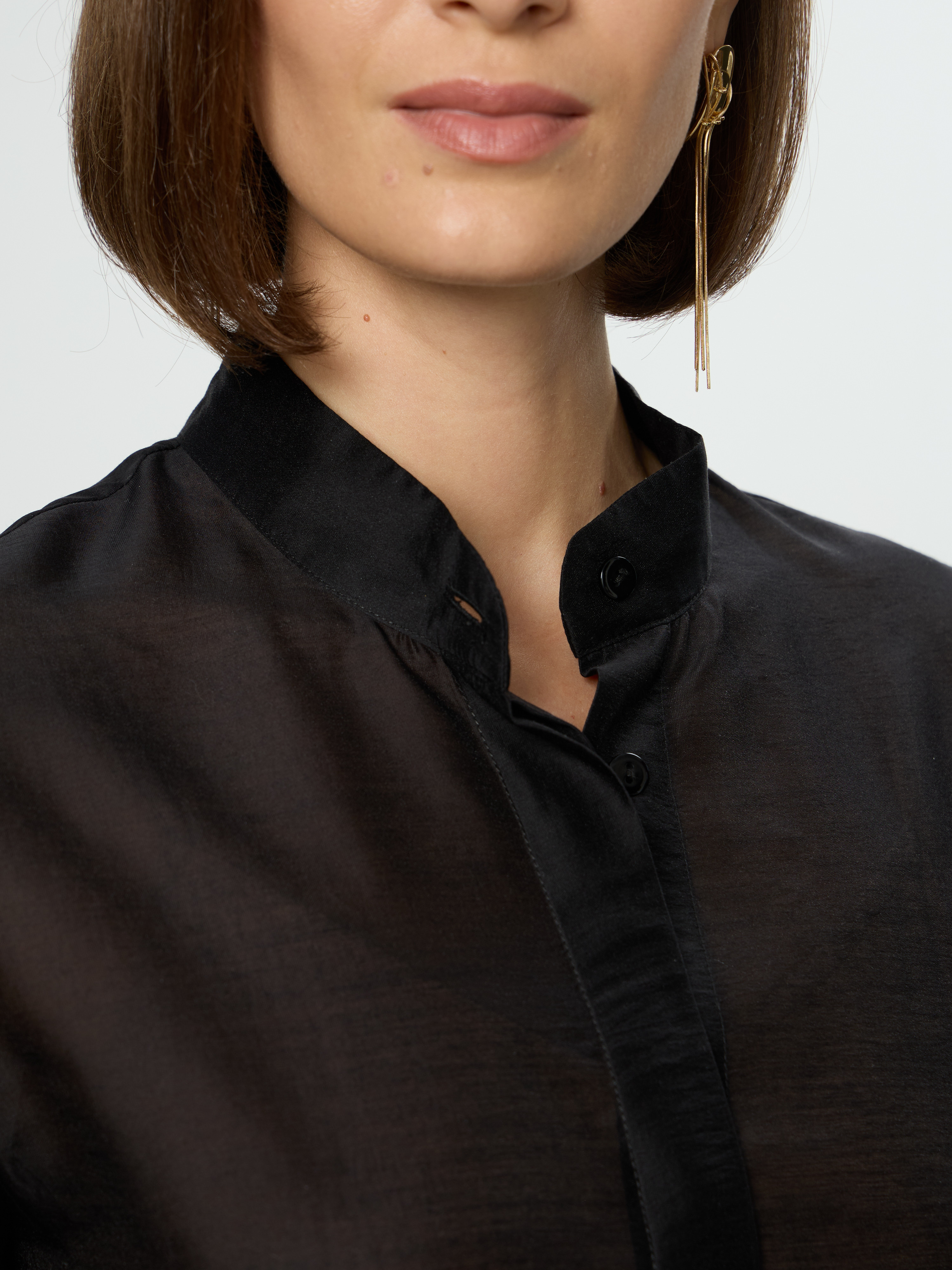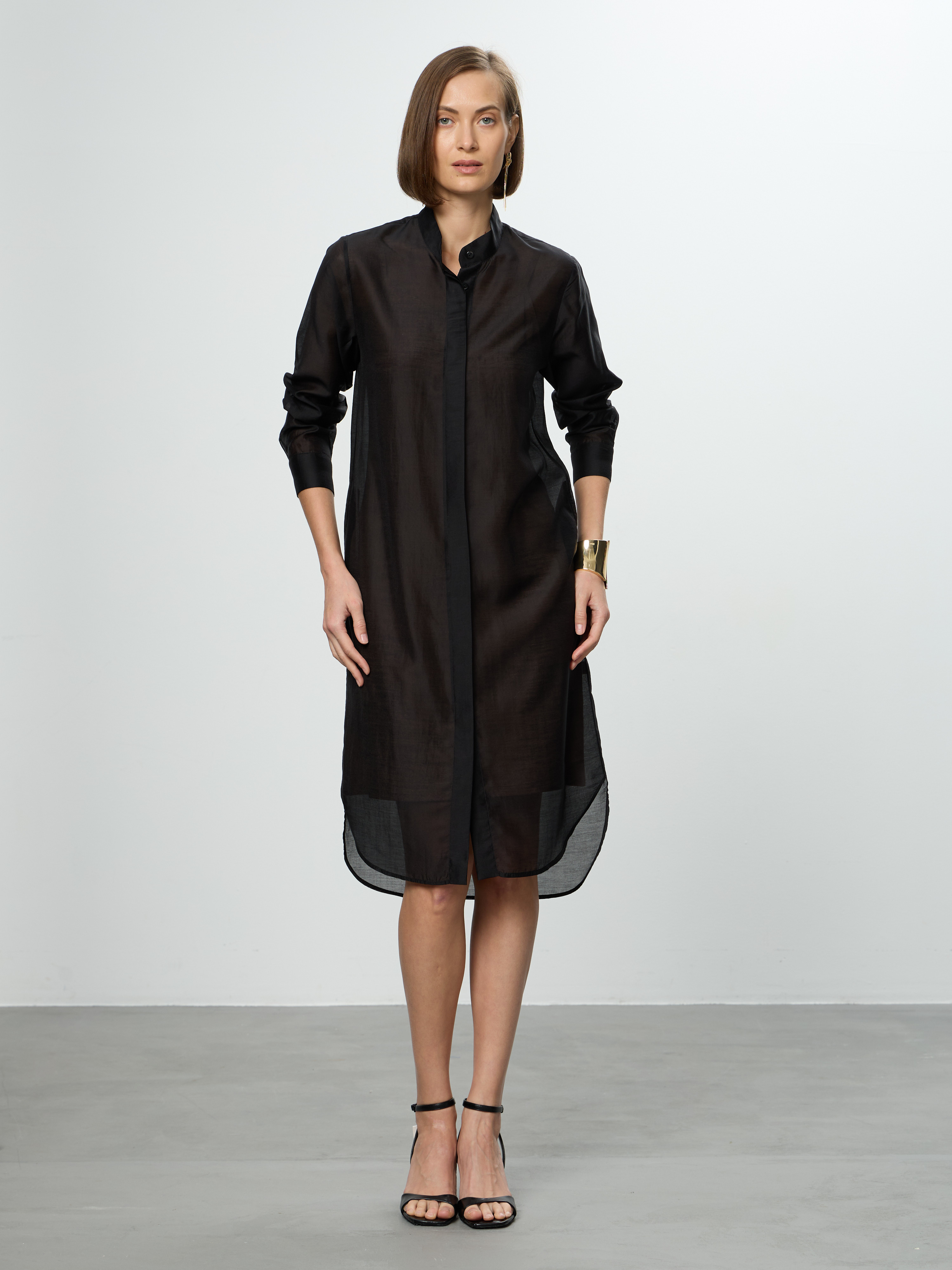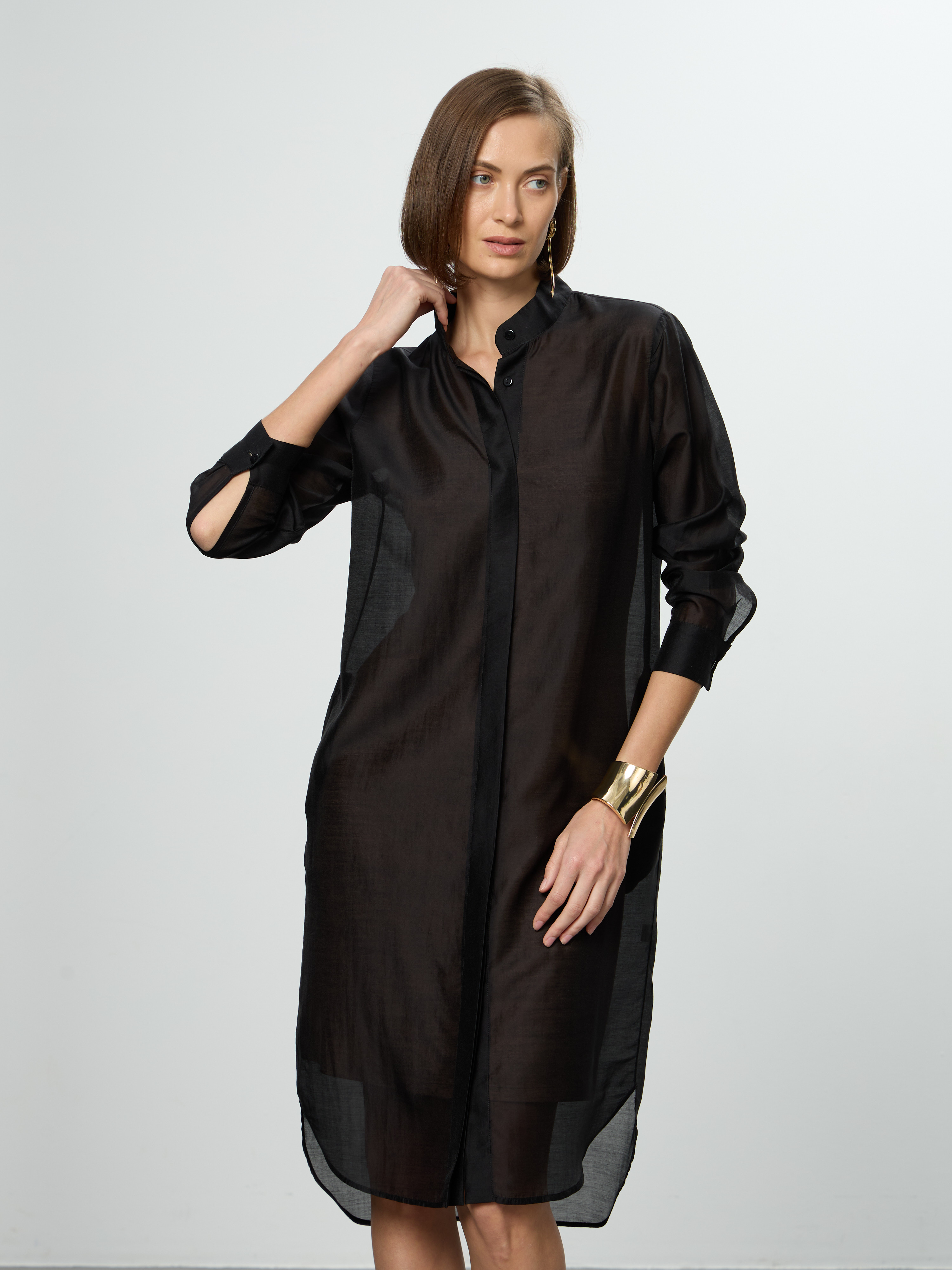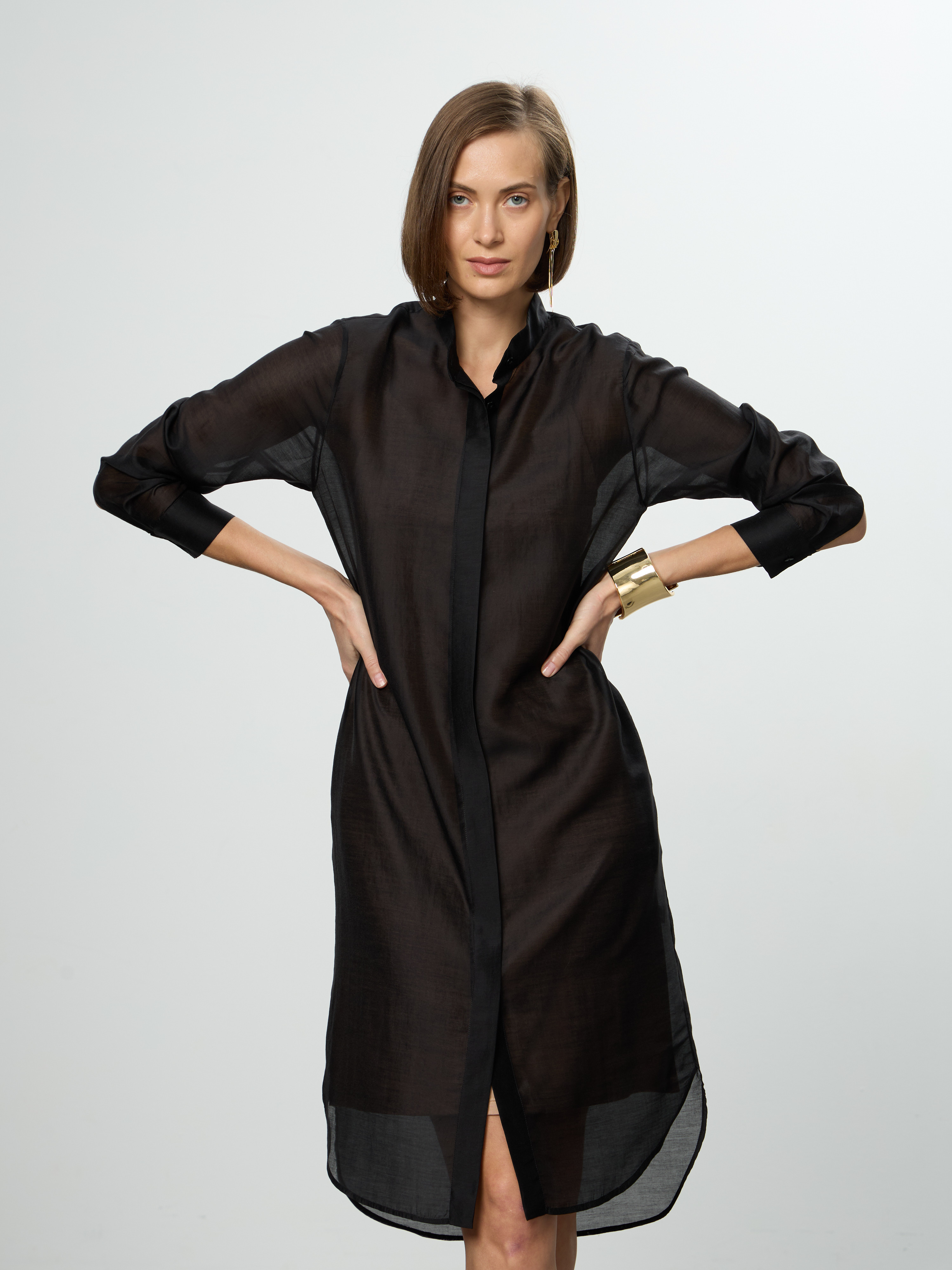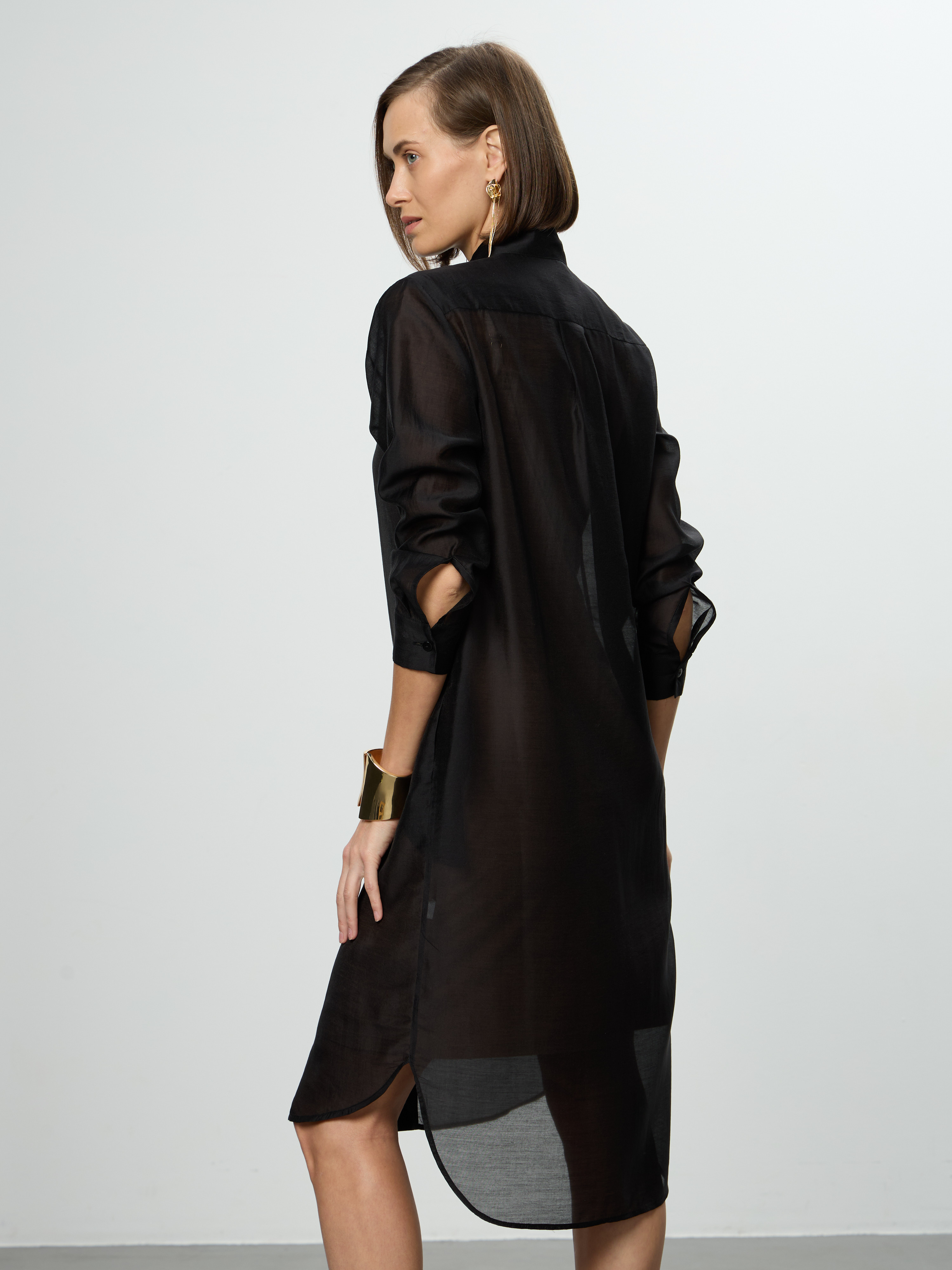 Платье-рубашка выполнено из тонкого полупрозрачного шифона.
