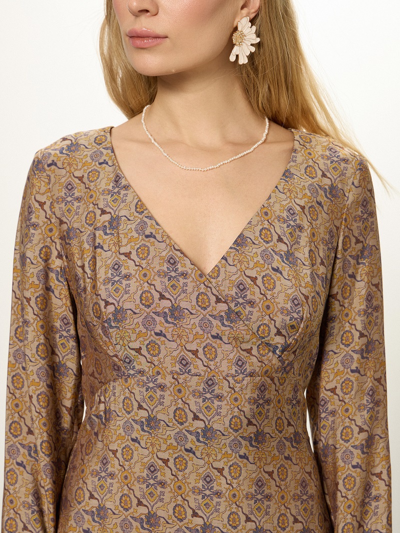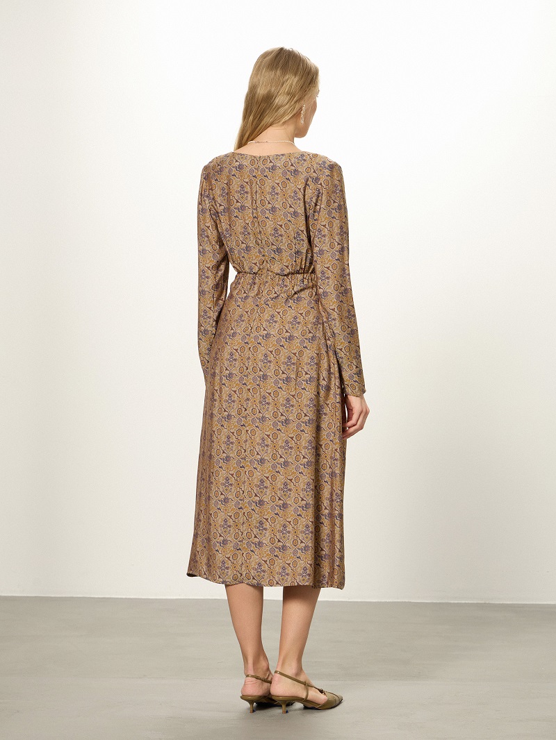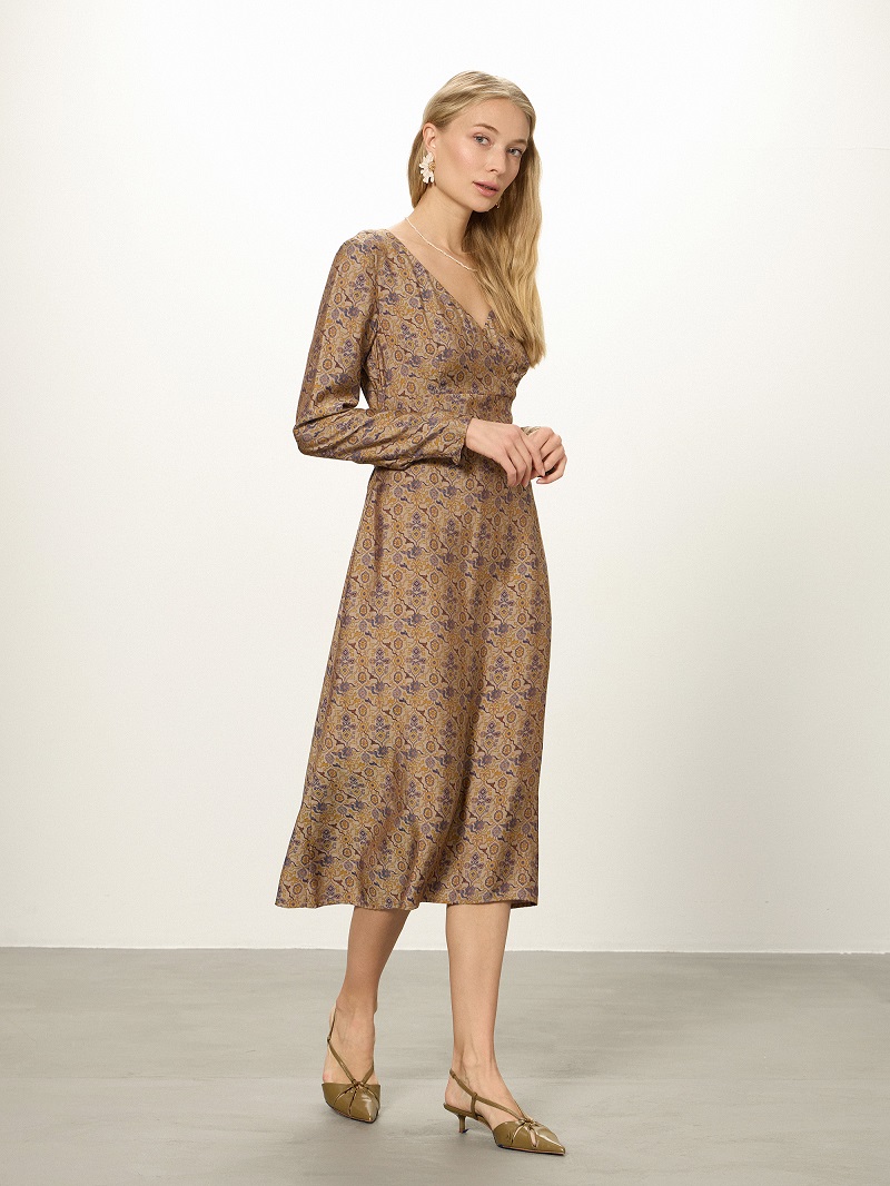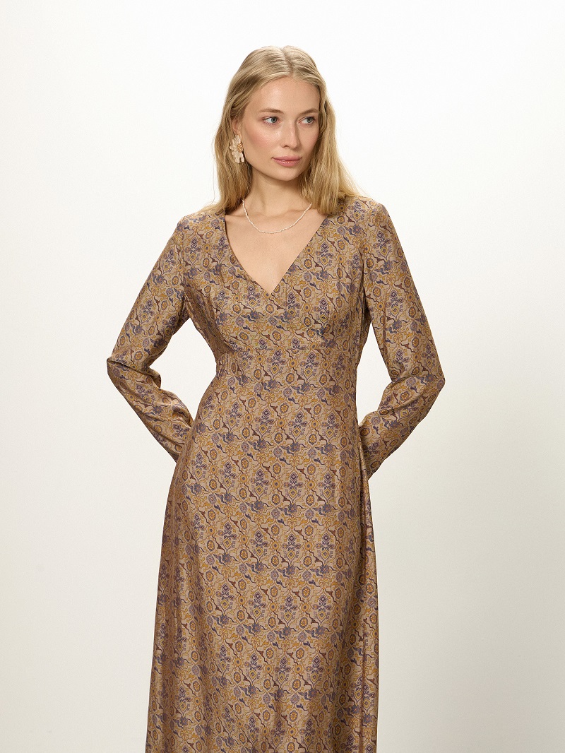 Расклешенная юбка миди и V-образный вырез делают это платье женственным и стильным.