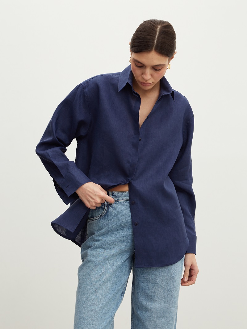 • Рубашка свободной посадки со спущенной линией плеча и длинным рукавом, который застегивается на манжете по низу.