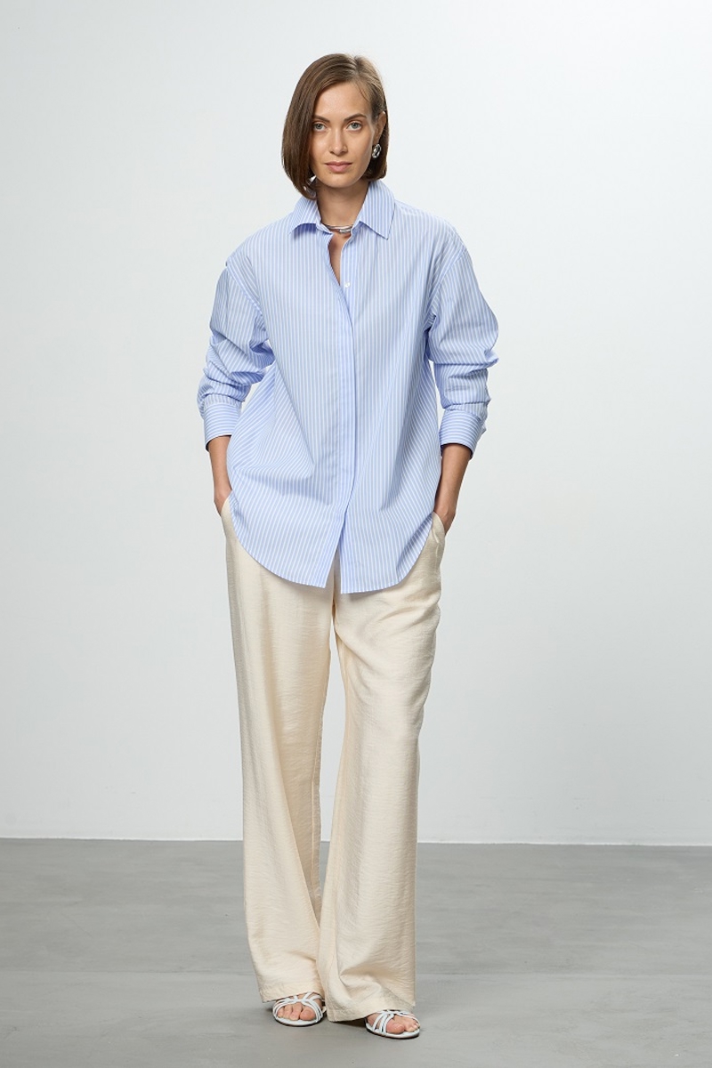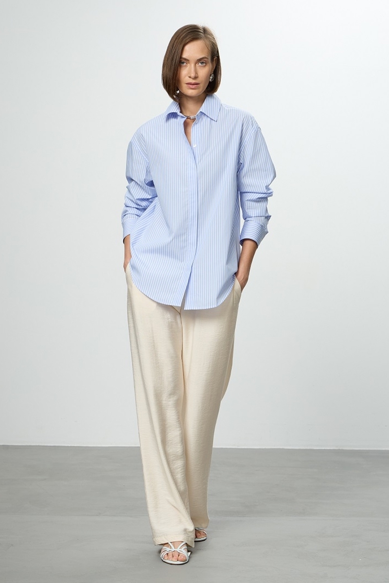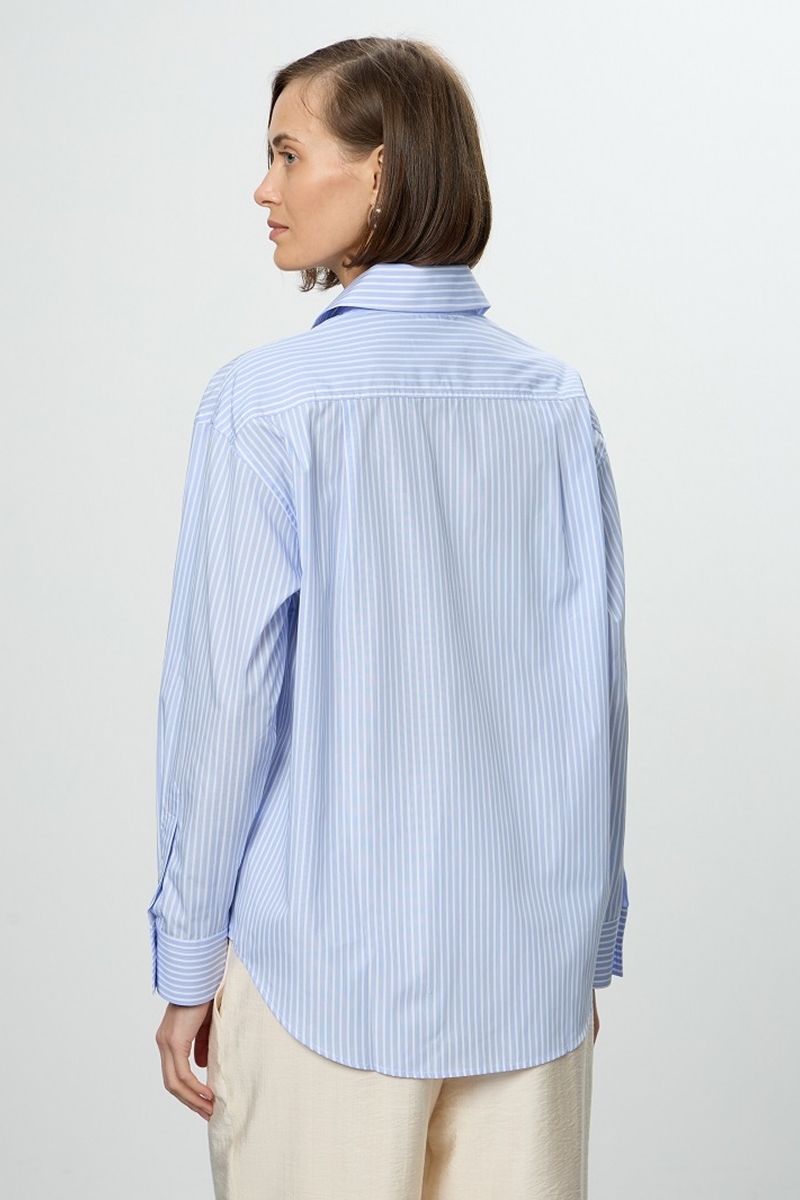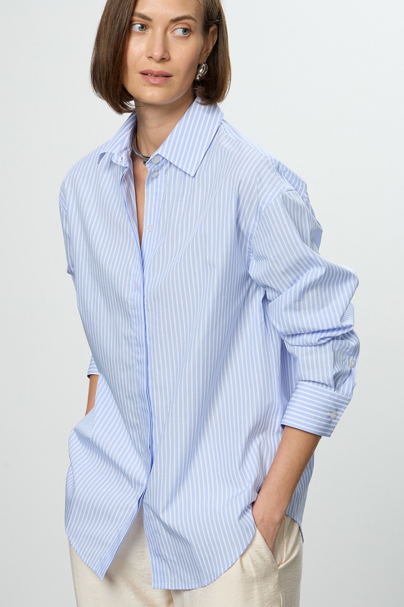 Рубашка свободной посадки со спущенной линией плеча и длинным рукавом, который застегивается на манжет по низу.