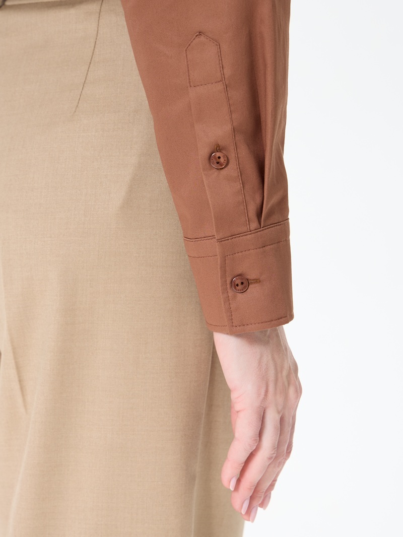 Классический рубашечный воротник хорошо держит форму, супатная застежка (пуговиц не видно, они закрыты планкой) обеспечивает лаконичность формы.