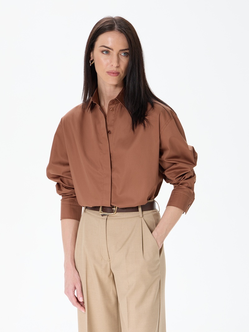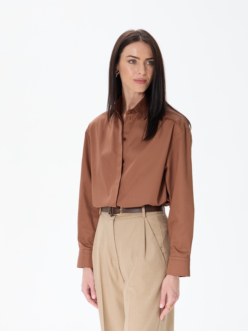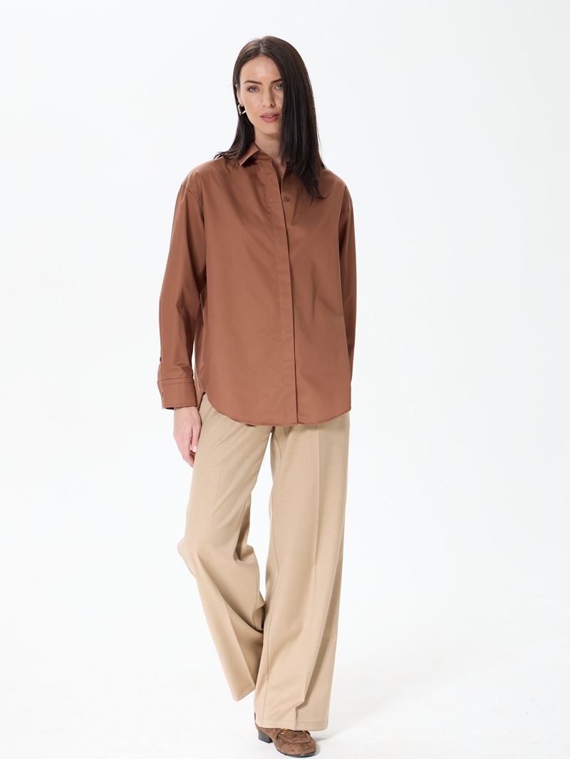 Рубашка свободной посадки со спущенной линией плеча и длинным рукавом, который застегивается на манжете по низу.