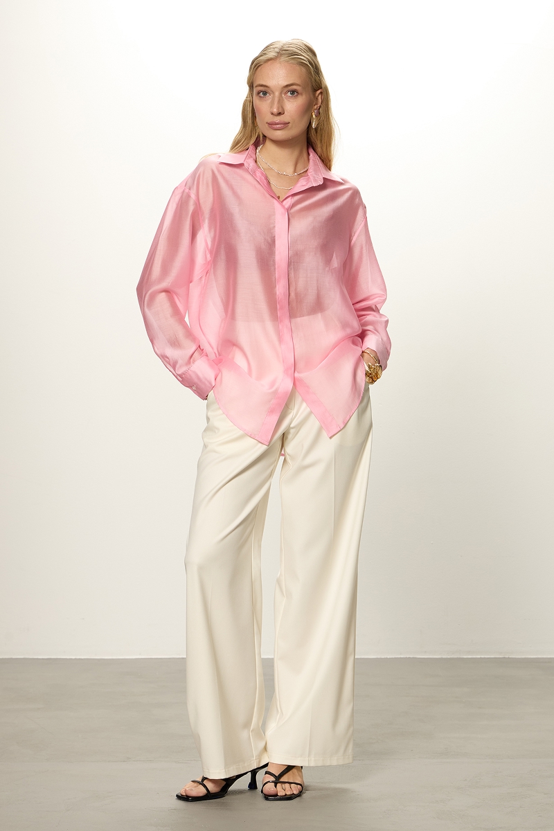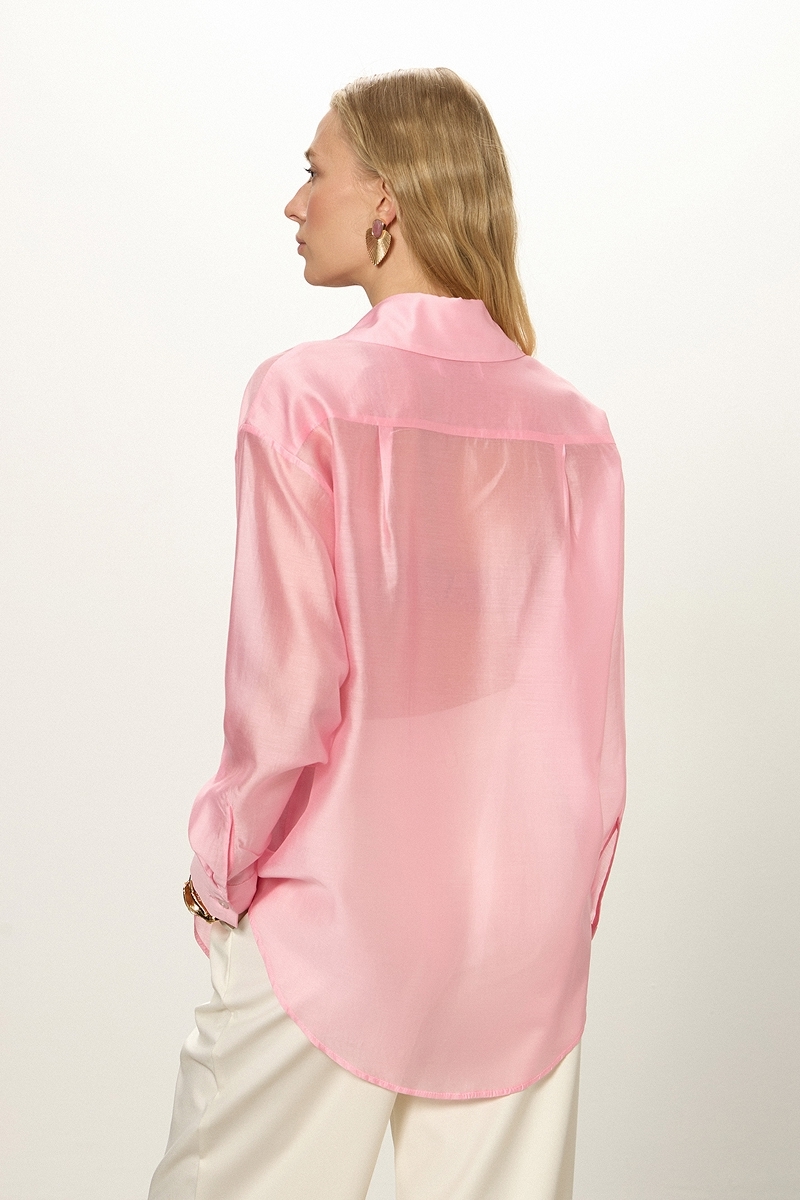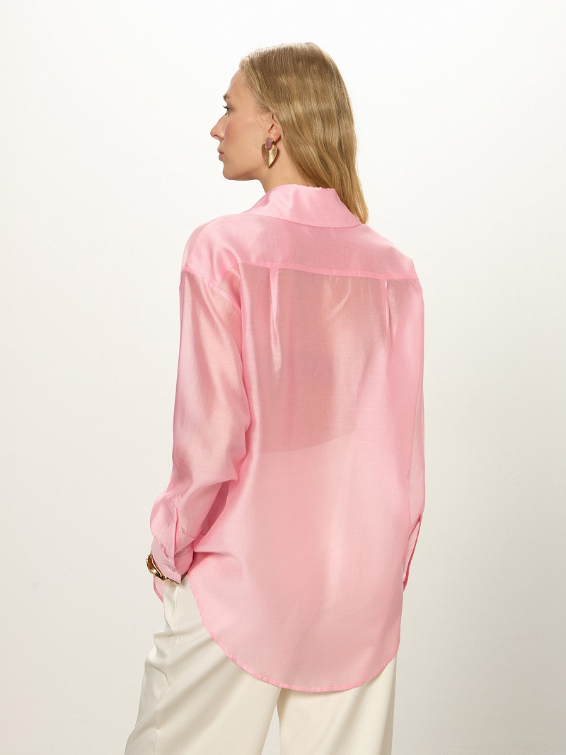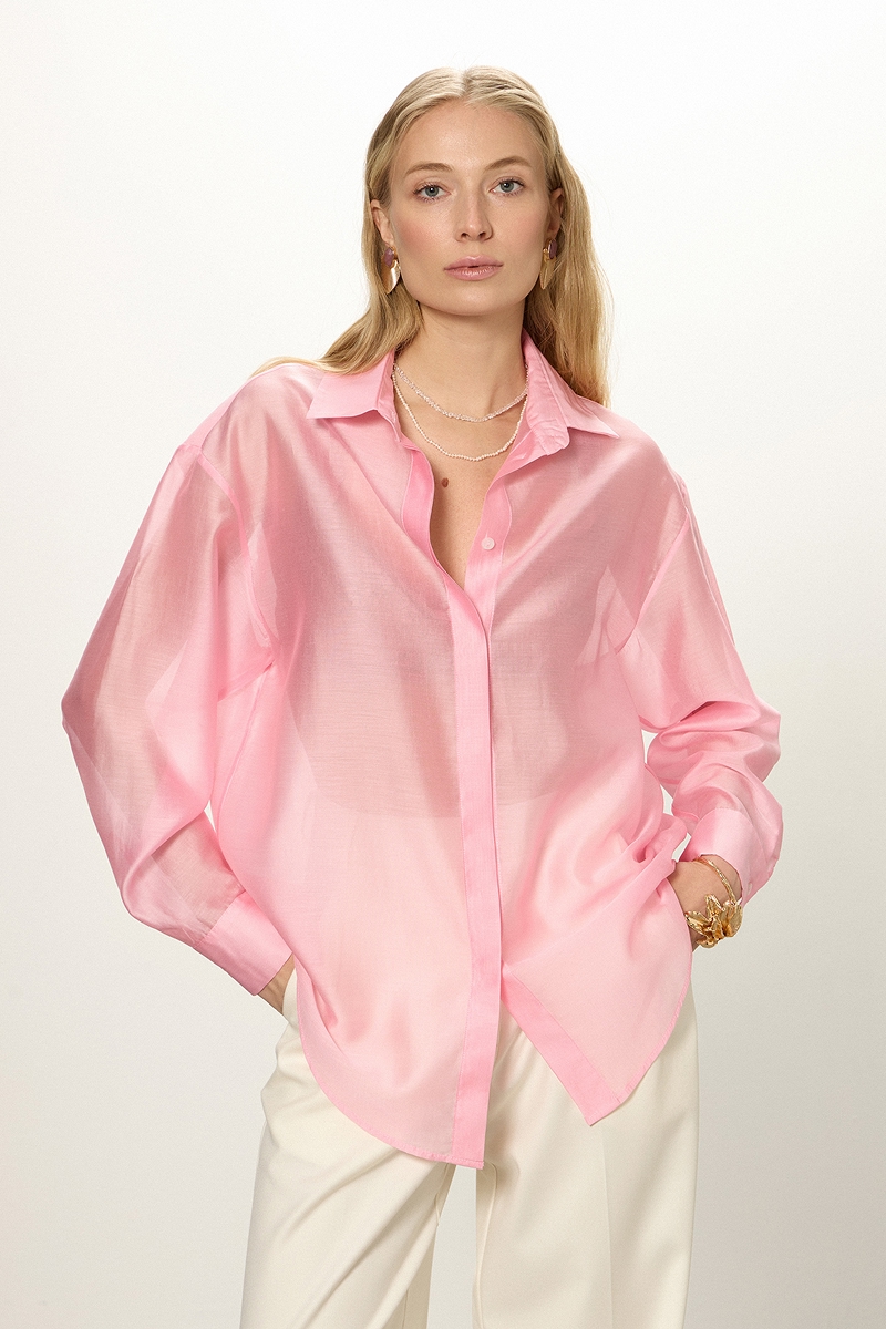 • Трендовая рубашка выполнена из полупрозрачной ткани.