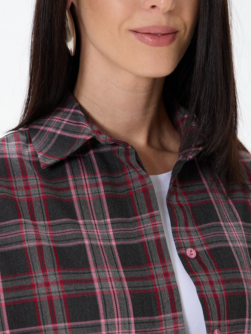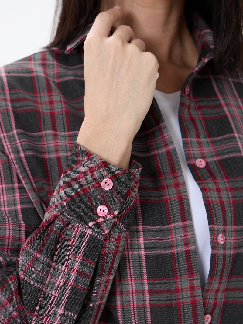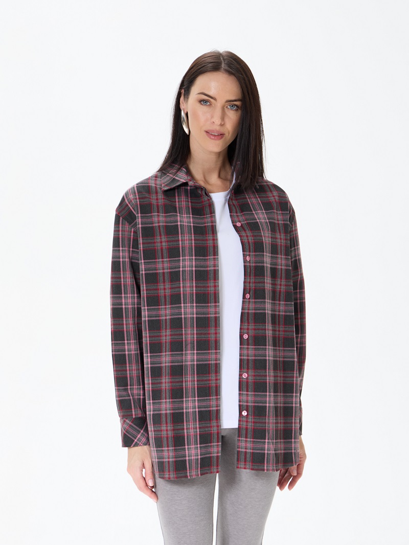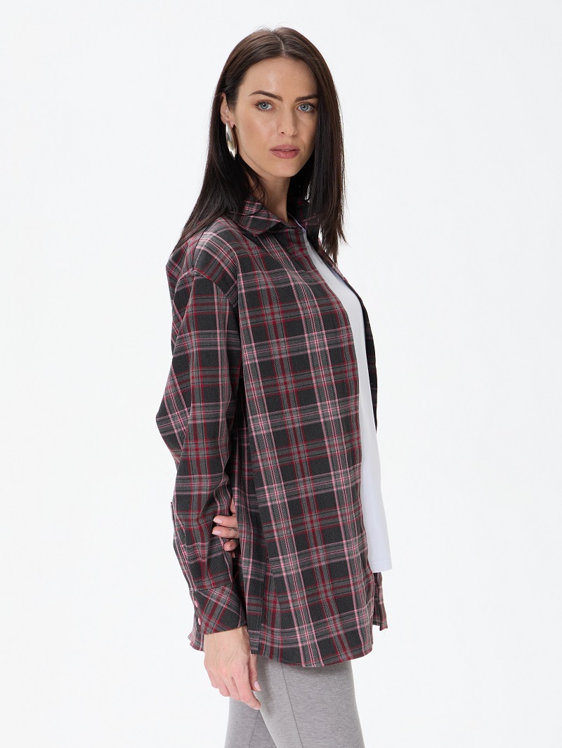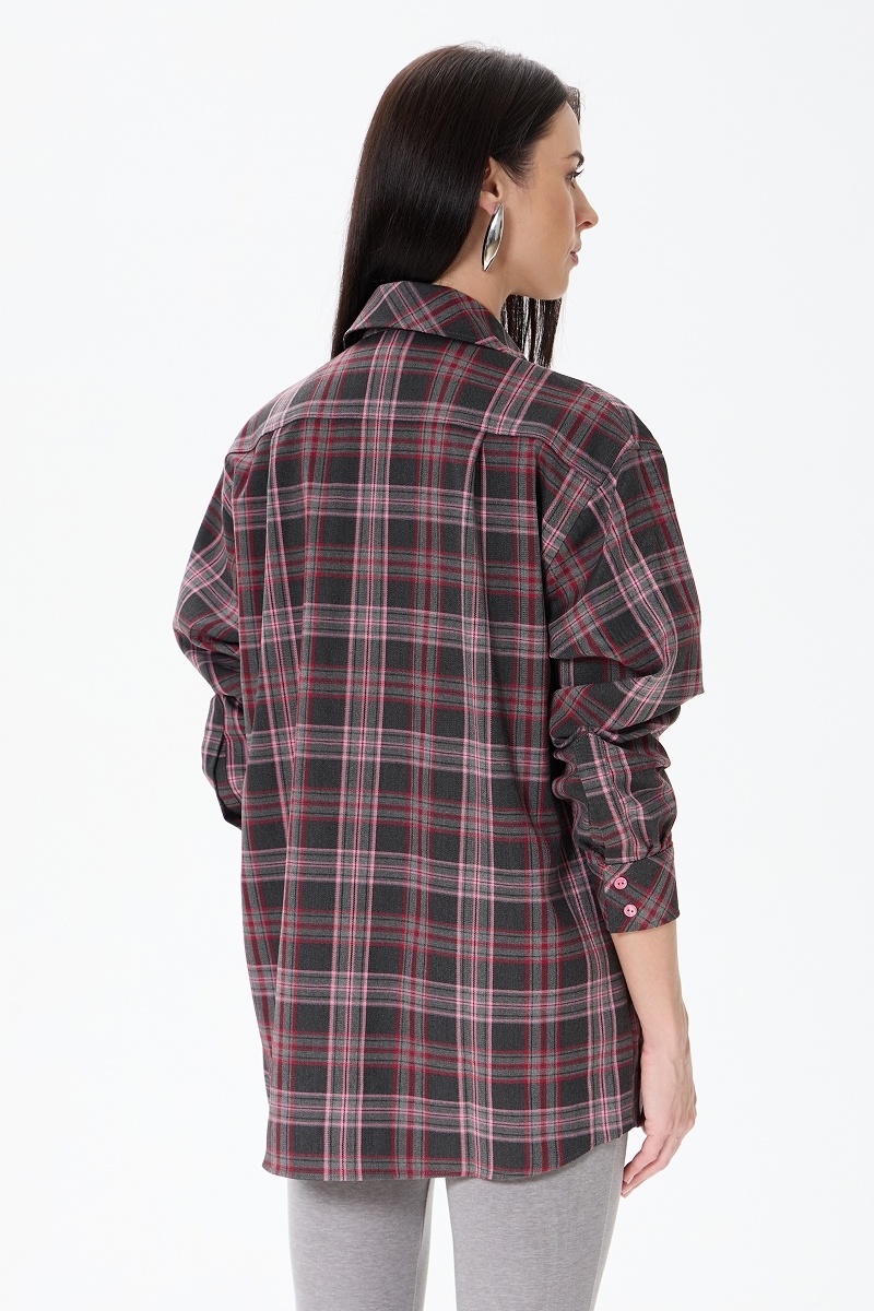 Удлиненная и объемная рубашка с эффектным принтом в клетку выполнена по премиальной технологии с закрытыми швами и брендированной фурнитурой.