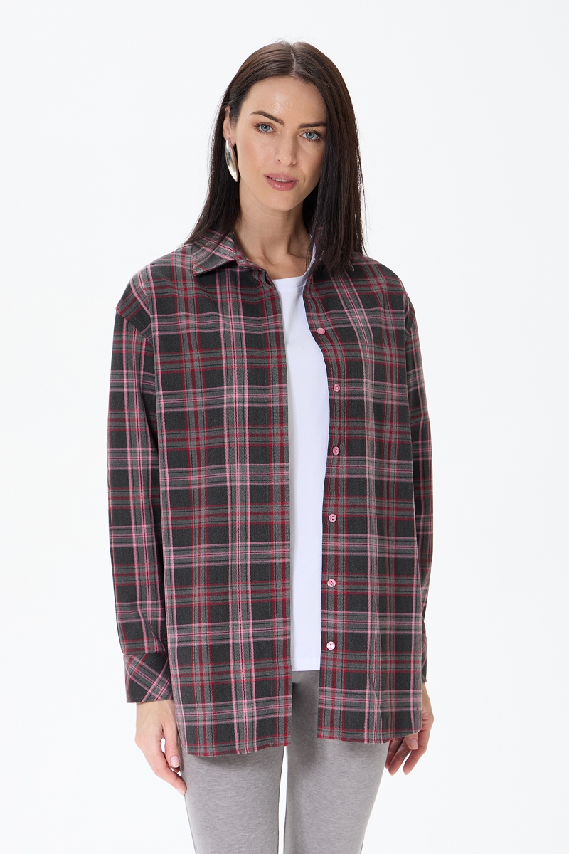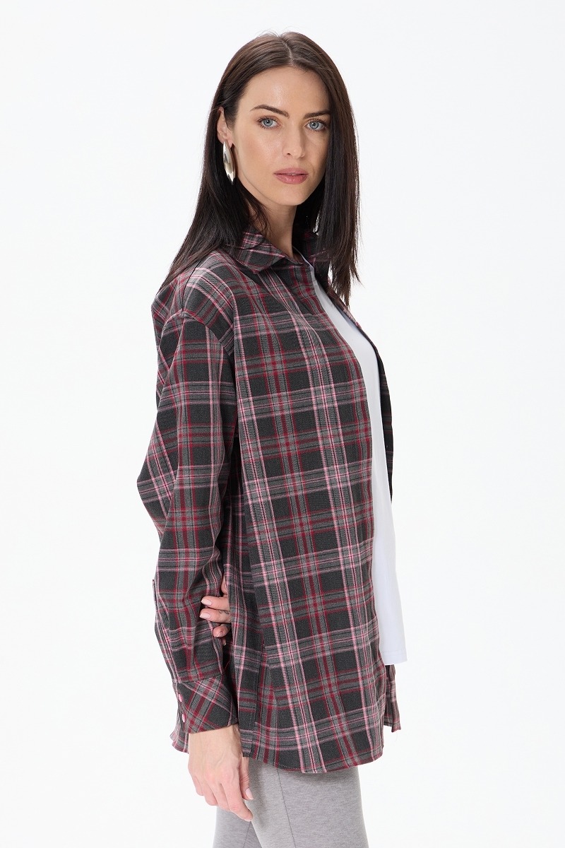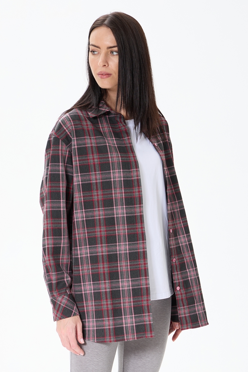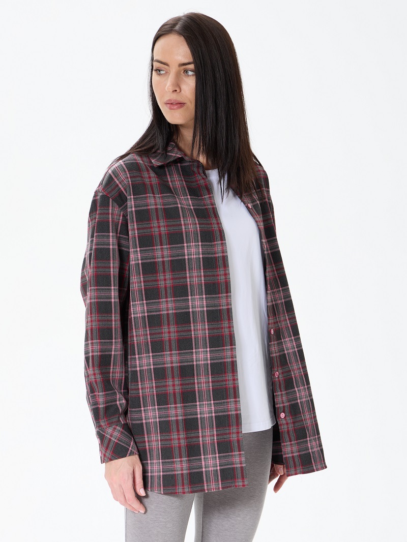 Удлиненная и объемная рубашка с эффектным принтом в клетку выполнена по премиальной технологии с закрытыми швами и брендированной фурнитурой.
