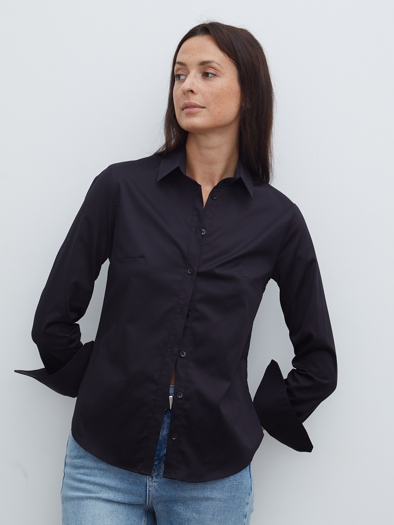 • Классическая линия плеча, длинный рукав с манжетом, рубашечный воротник со стойкой.