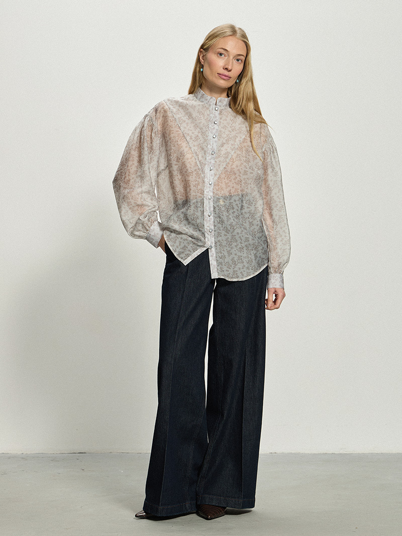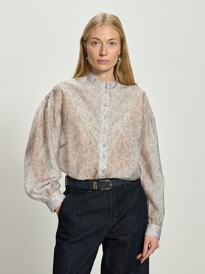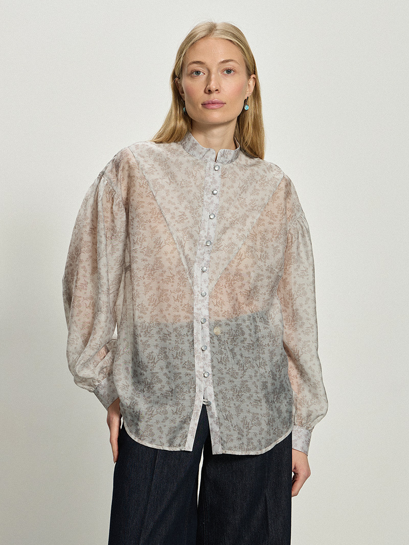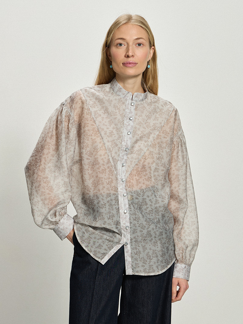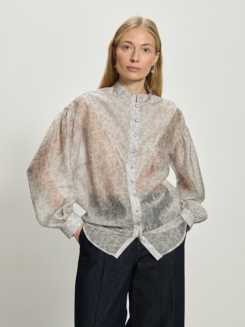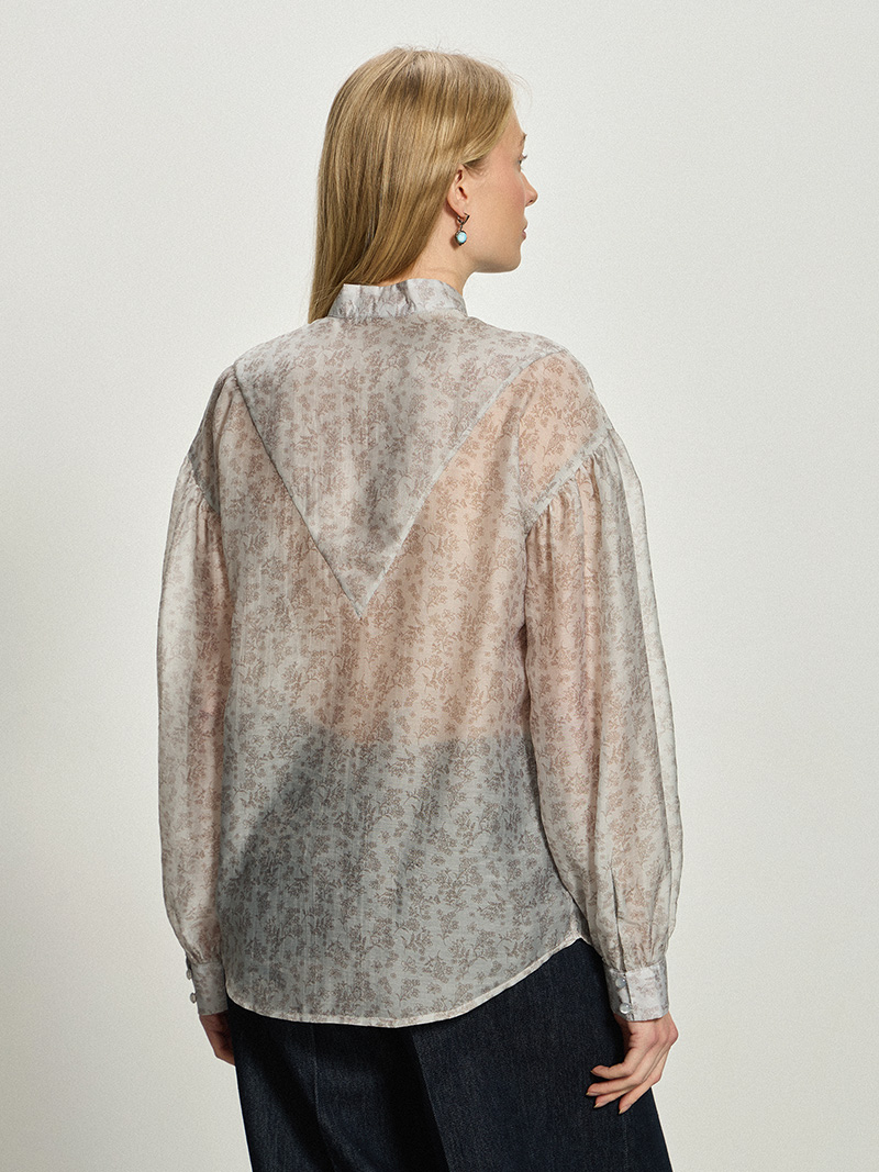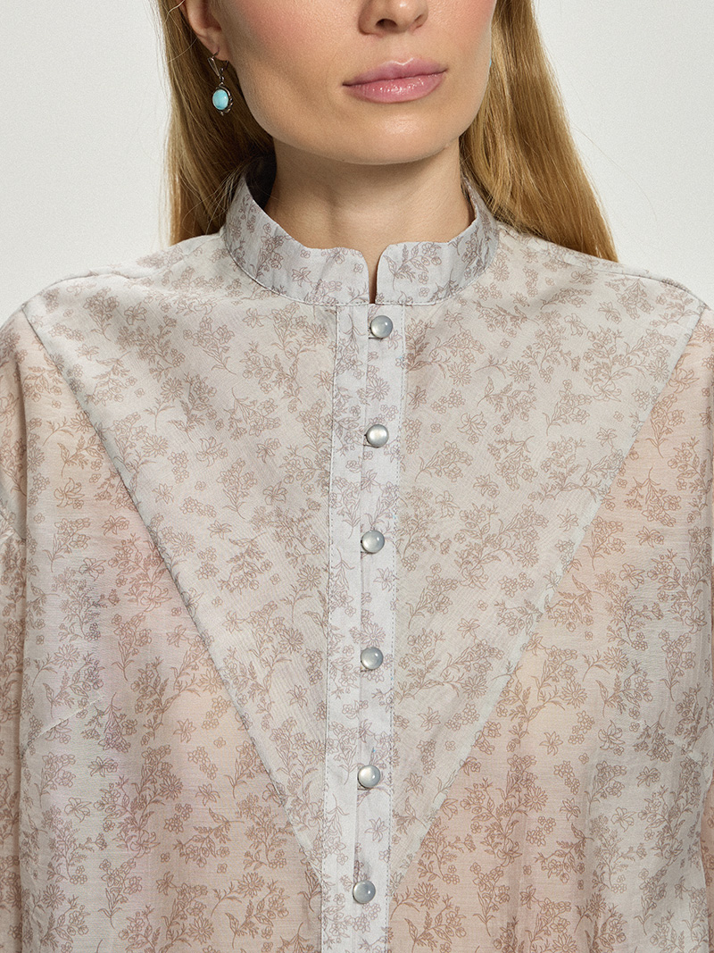 Рубашка выполнена из тонкого вискозного шифона, материал имеет ненавязчивый цветочный принт на серо-голубом фоне. Рубашка имеет свободную посадку, спущенную линию плеча, длинный рукав и декоративные треугольные кокетки спереди и сзади. Рубашка застегивается на миниатюрные пуговки с воздушными петлями. Отлично сочетается с джинсами и однотонными брюками, юбками.