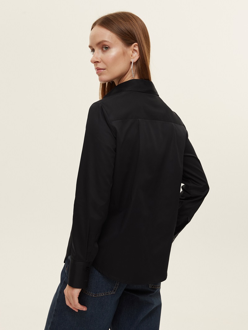 • Классическая линия плеча обеспечивает комфортную посадку под жакет/жилет. Длинный рукав заканчивается широкой манжетой с пуговицами.