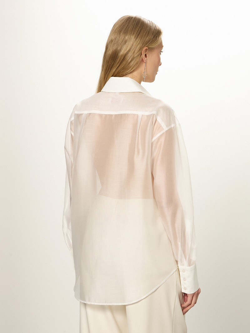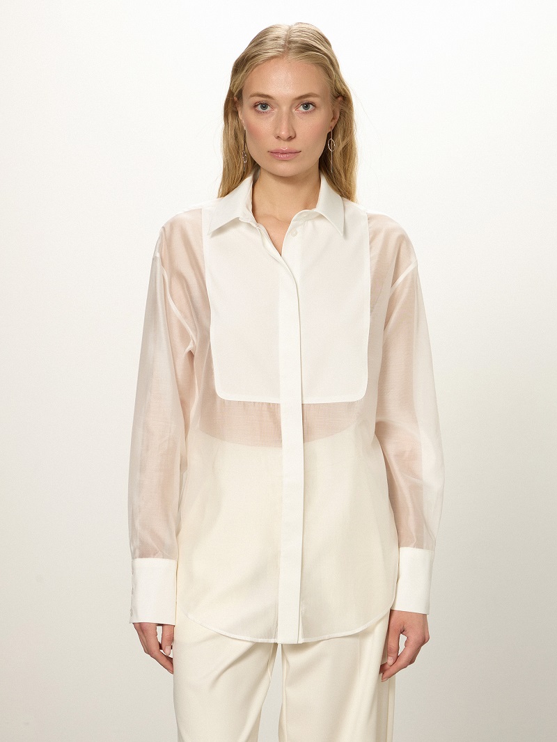 Стильная и необычная рубашка в стиле мужской рубашки под смокинг, выполненная из полупрозрачного шифона. Вставки из плотной ткани добавляют изделию строгости и элегантности. Качественная посадка, премиальные закрытые швы, лаконичная супатная застежка позволяют выглядеть достойно и эффектно на любом мероприятии.