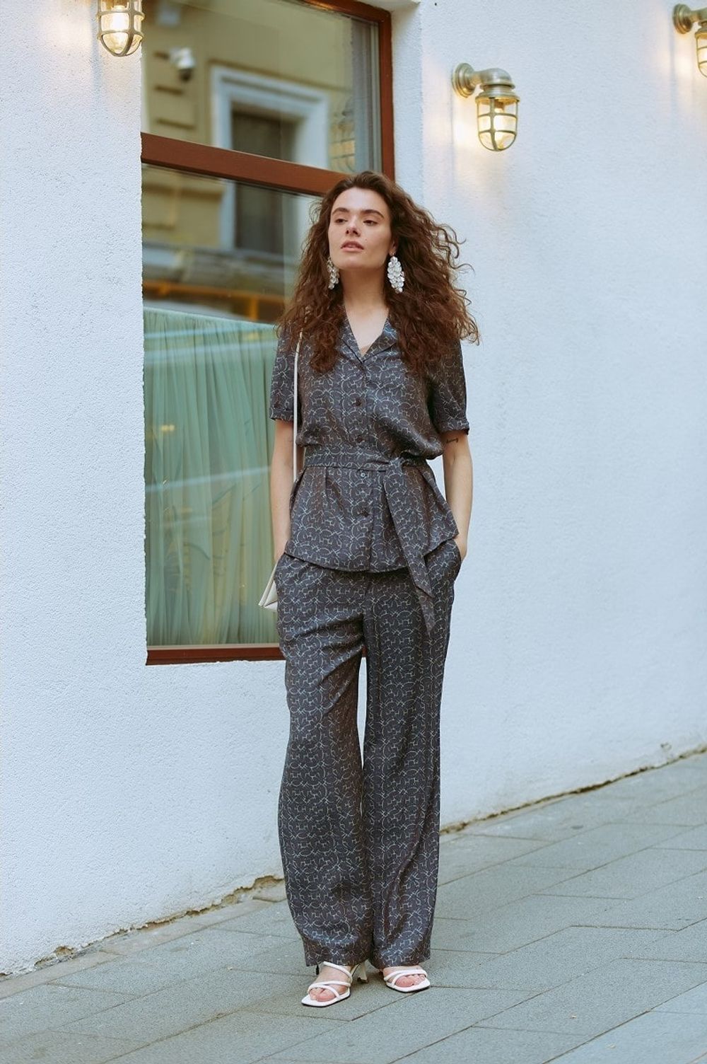 Рубашка с коротким рукавом из итальянской вискозы в принтованном и однотонном материале. Рубашка имеет премиальную обработку швов и качественную брендированную фурнитуру, силуэт можно приталить с помощью пояса. Мягкая струящаяся ткань позволит чувствовать себя комфортно в теплую погоду. Рубашка образует стильный лук вместе с брюками-палаццо из того же материала.