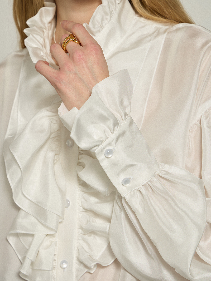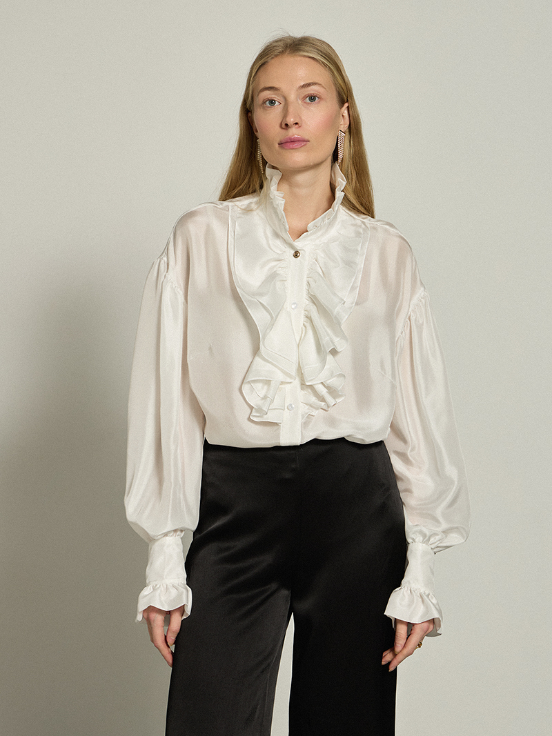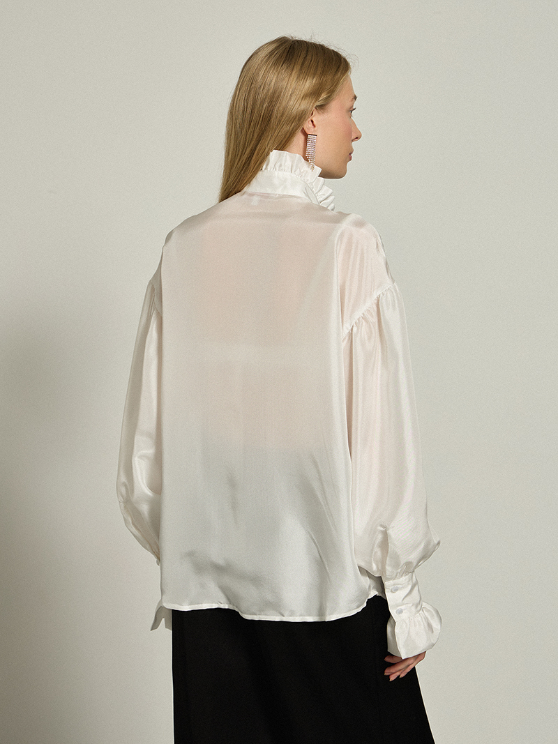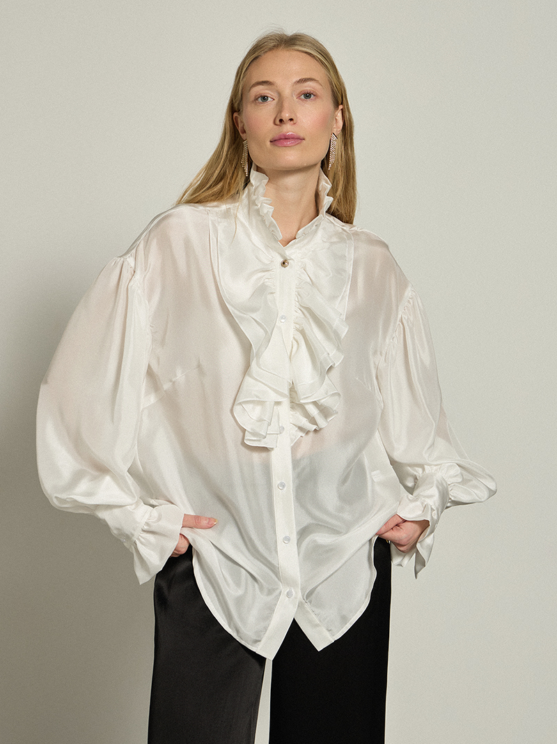 Рубашка из нежного натурального шёлкового шифона имеет over-size посадку, спущенную линию плеча и длинный рукав.