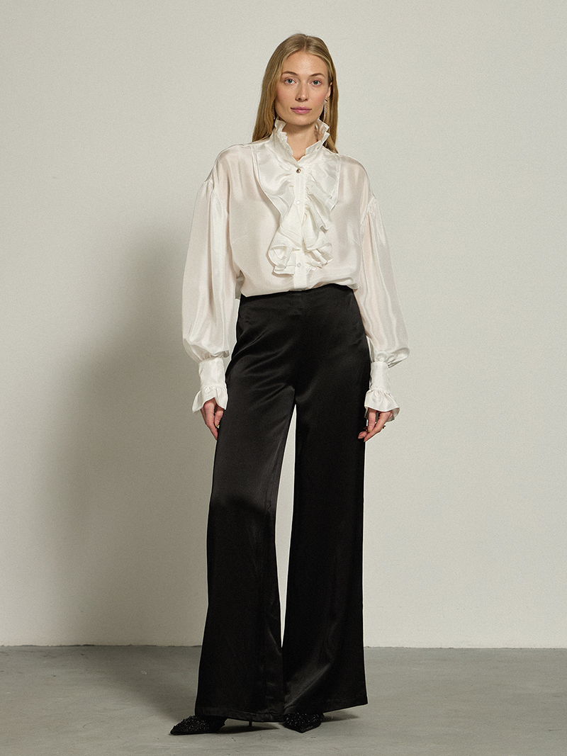 Рубашка очень эффектная, поэтому лучше ее сочетать с лаконичными юбками и брюками.