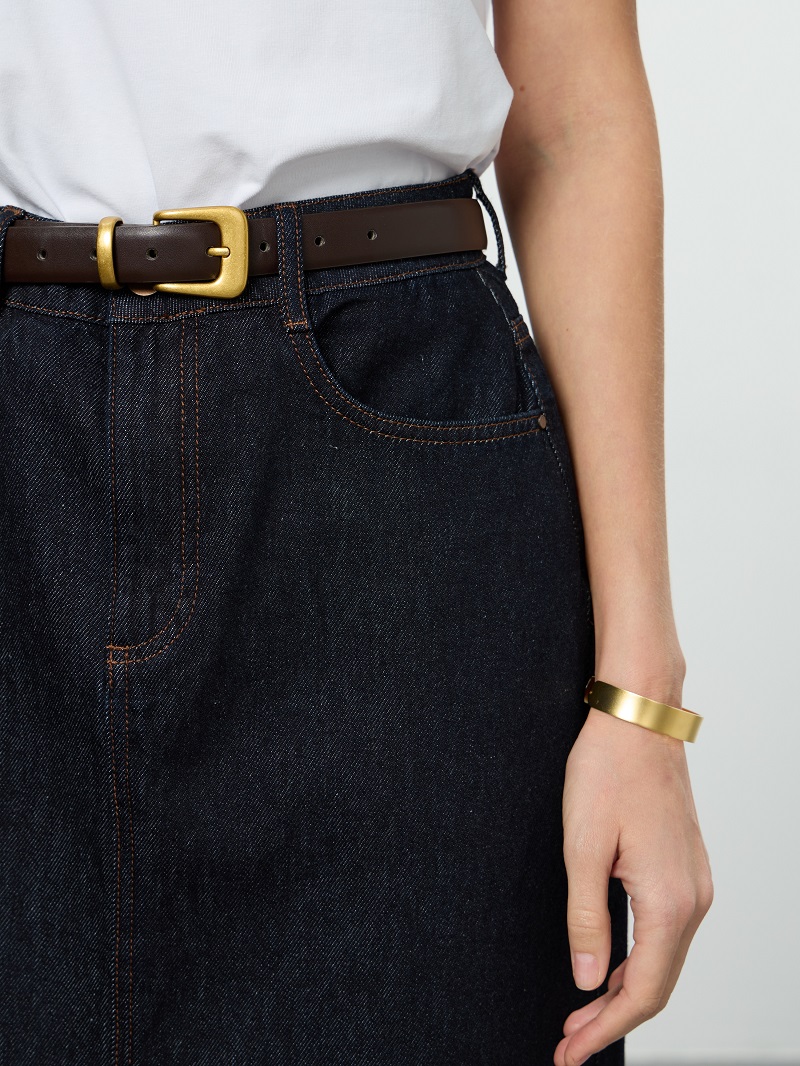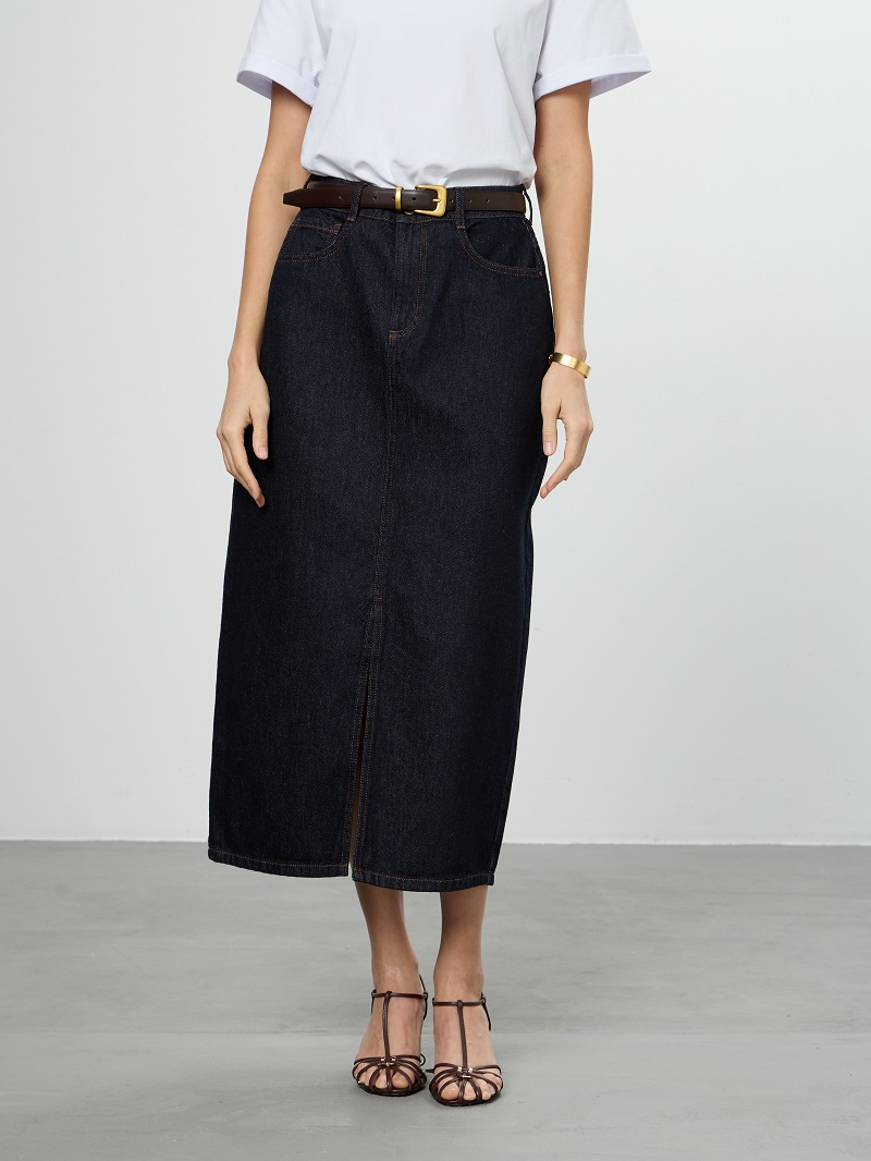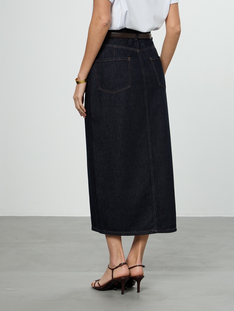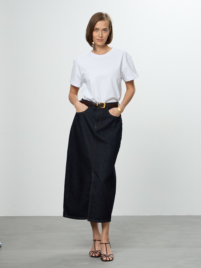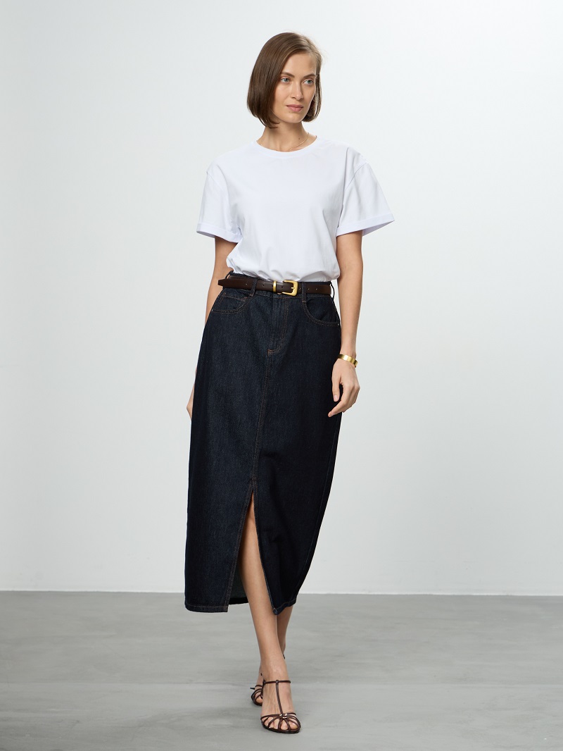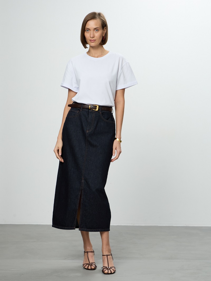 • Джинсовая юбка прямого силуэта в классическом синем цвете с посадкой на талии. Застежка - гульфик и металлическая пуговица.