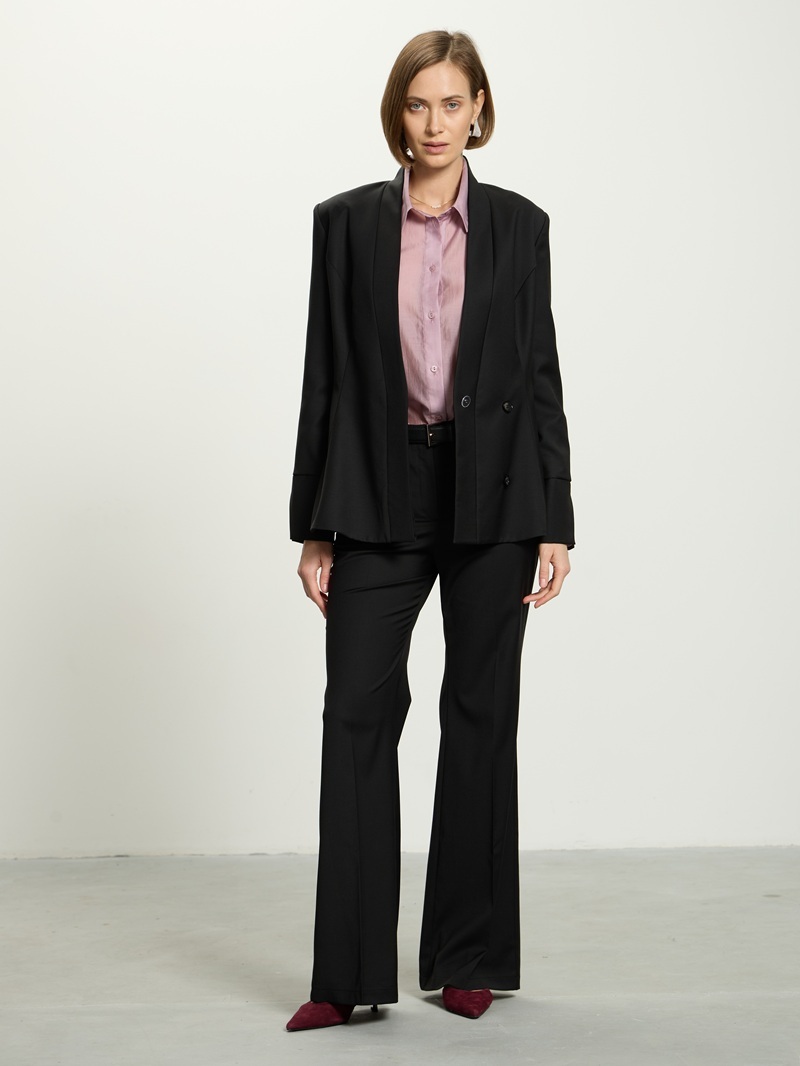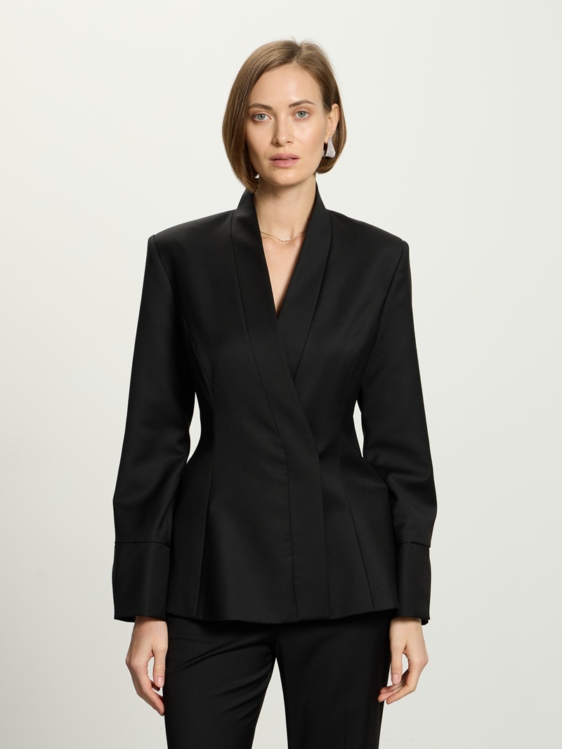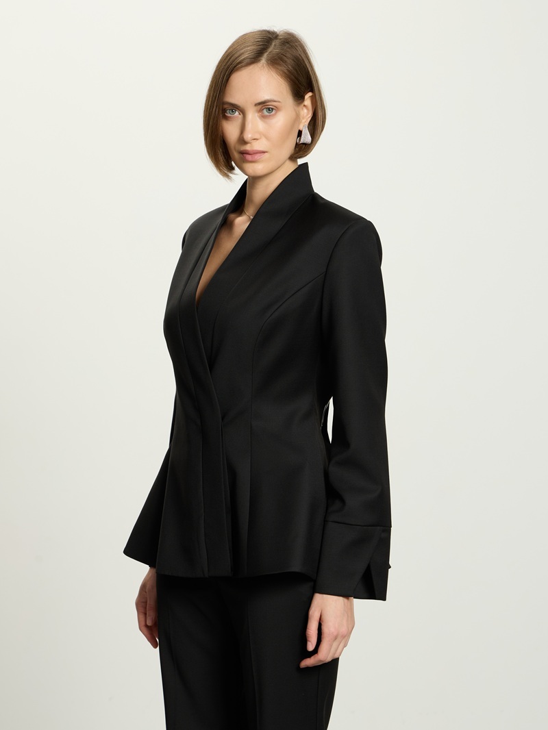 Такой жакет будет одинаково стильно смотреться и в офисе, и на вечернем мероприятии. Особенно эффектно он будет выглядеть в комплекте с брюками-палаццо из той же ткани.